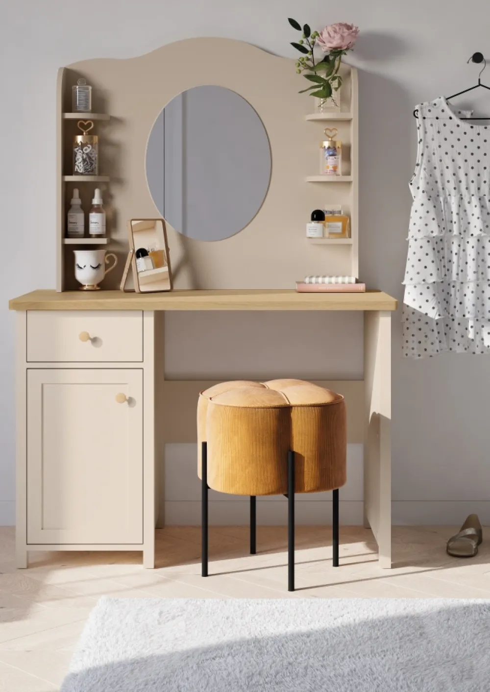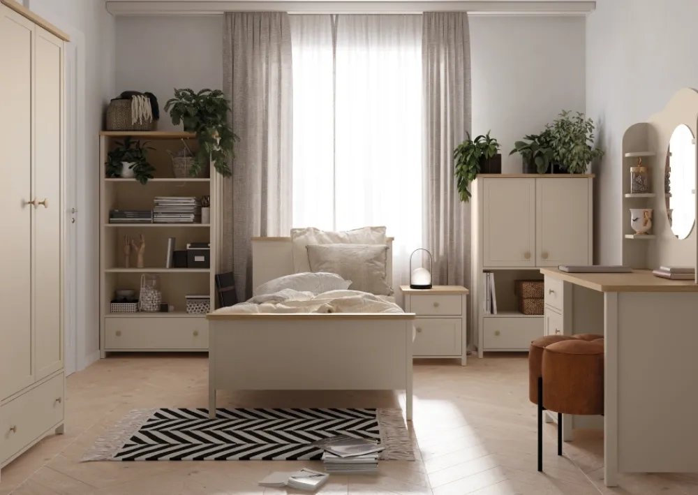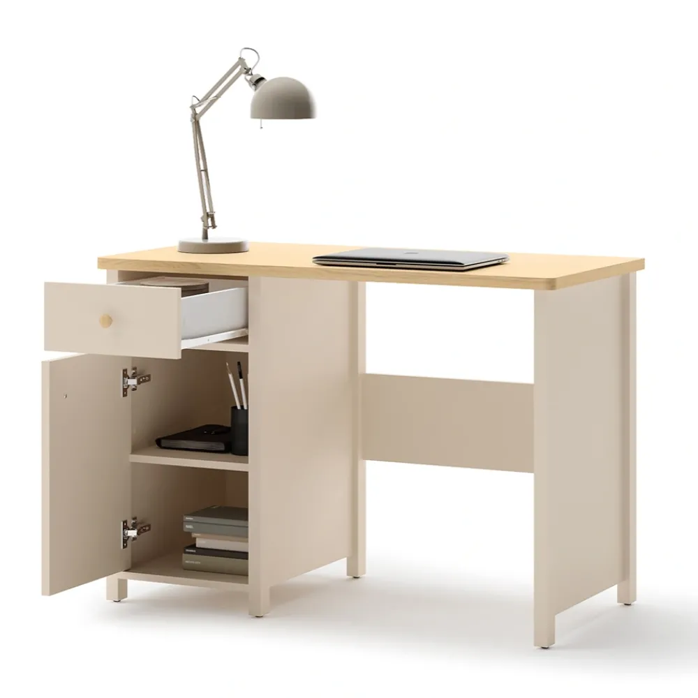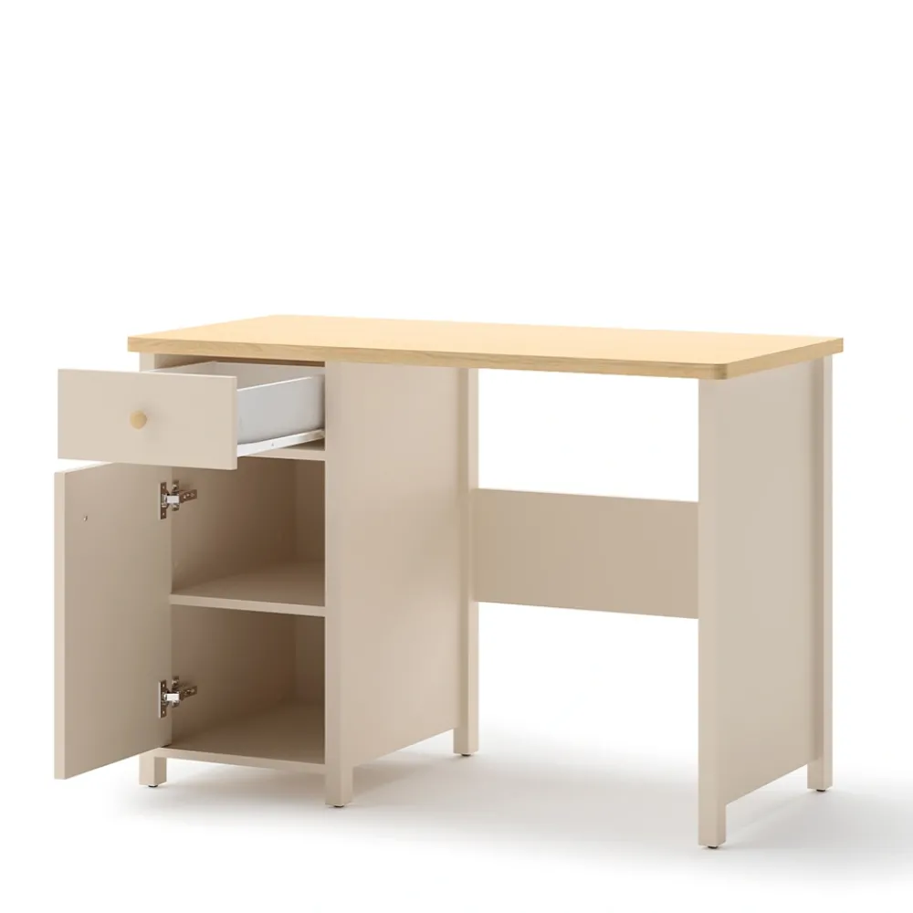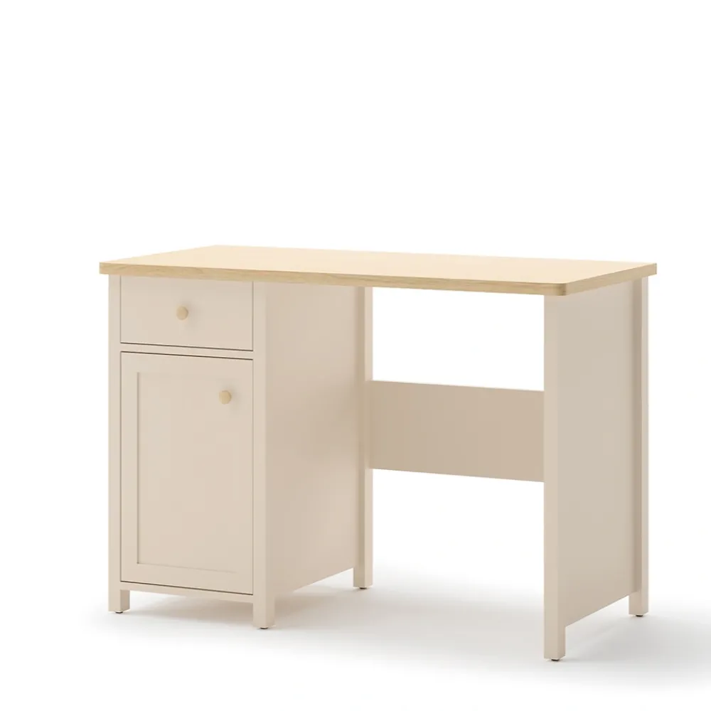 Dobrze zaprojektowane biurko dziecięce to inwestycja w rozwój dziecka i jego komfort nauki. Model Story SO-03 oferuje szeroki blat, na którym zmieszczą się książki, zeszyty i komputer. Ergonomiczna wysokość sprzyja prawidłowej postawie podczas siedzenia, co jest niezwykle ważne dla zdrowia dziecka. Oprócz tego subtelna kolorystyka piaskowego beżu w połączeniu z drewnianymi akcentami sprzyja koncentracji. Biurko z szufladą i szafką to również świetna baza do wykształcenia nawyku porządkowania przestrzeni. Dzięki solidnej konstrukcji wykonanej z płyty laminowanej z obrzeżami ABS mebel jest odporny na codzienne użytkowanie. To rozwiązanie, które łączy design, wygodę i praktyczność.