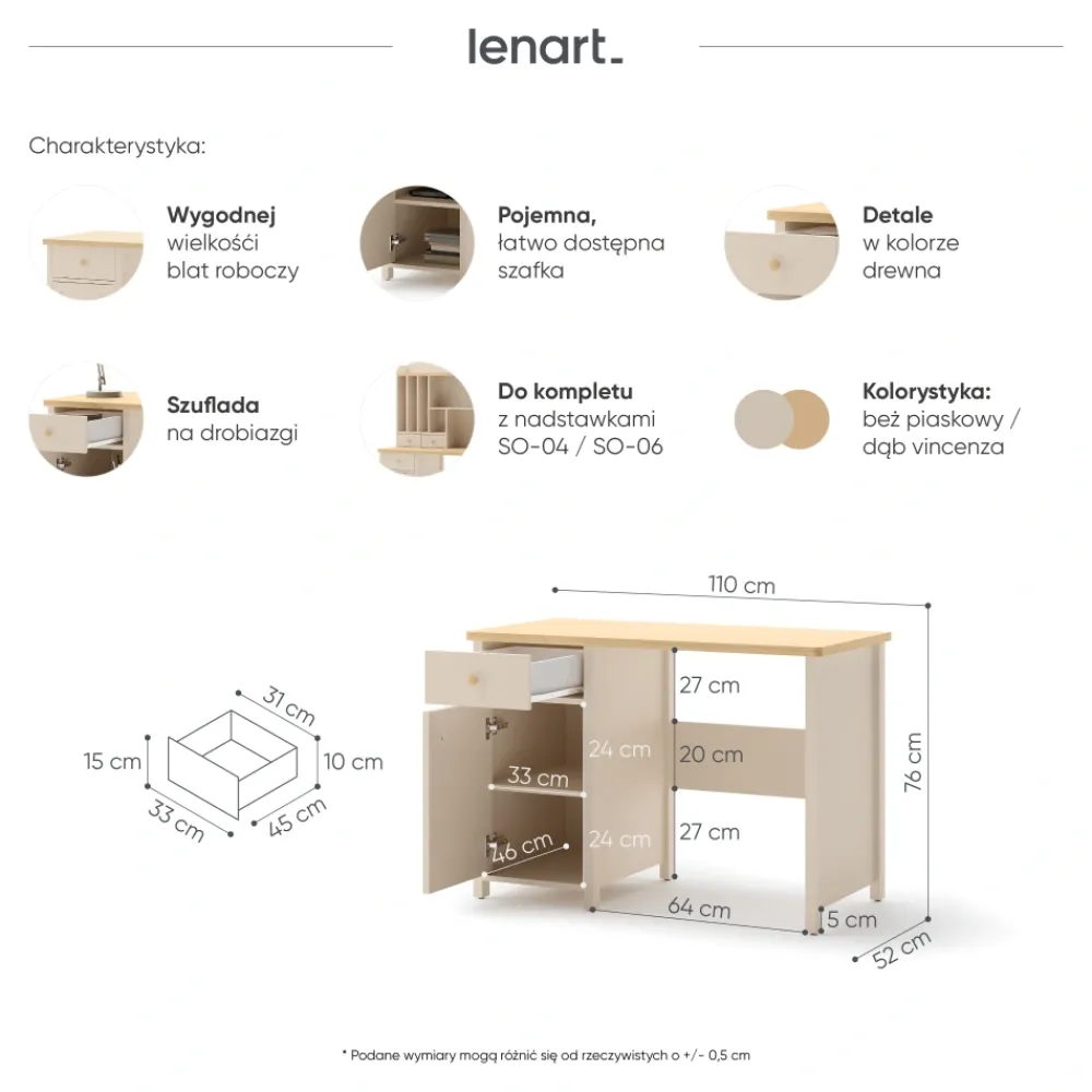 Biurko dziecięce Lenart Story SO-03 w kolorze piaskowym z dodatkami w odcieniu dąb vincenza bielona to idealne połączenie elegancji i praktyczności. Subtelna kolorystyka sprawia, że mebel wpasuje się w różne aranżacje wnętrz – od klasycznych po nowoczesne. Duży blat roboczy zapewnia komfortowe warunki do nauki, odrabiania lekcji i rozwijania pasji. To biurko z szufladą i szafką, które pomaga w utrzymaniu porządku w dziecięcym pokoju. Wygodna konstrukcja została zaprojektowana z myślą o ergonomii i codziennym użytkowaniu. Dzięki zastosowaniu laminowanej płyty o podwyższonej trwałości biurko posłuży przez wiele lat. To propozycja dla rodziców, którzy szukają solidnego i stylowego mebla do pokoju swojego dziecka.