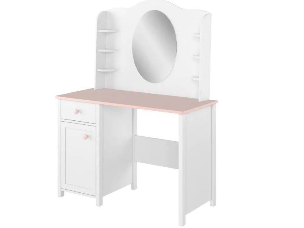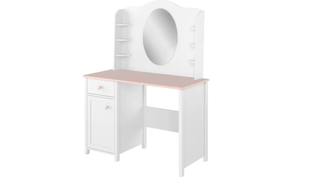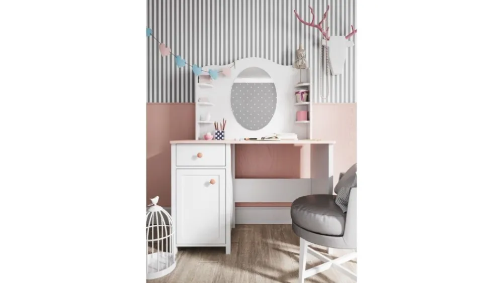 Bardzo ciekawą propozycją kolekcji jest zestaw – Biurko + Nadstawka. Niezwykle funkcjonalna propozycja, która dzięki połączeniu nadaje zupełnie zupełnie inny wymiar – biurko nie wygląda jak zwykły mebelek tego typu. Zestaw możemy traktować jak swojego rodzaju pierwszą toaletkę z dodatkowym miejscem na przybory i dodatki. Dostępne jest również połączenie biurka z nadstawką z półkami i organizerami – wtedy tworzy się pierwszy sekretarzyk małej księżniczki.