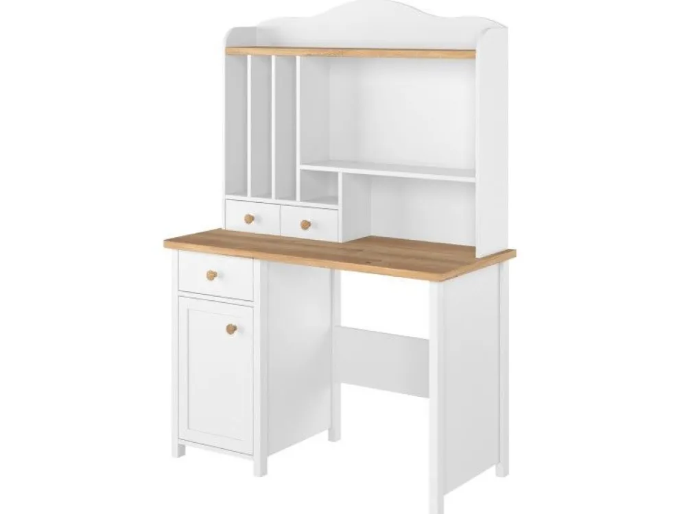 Bardzo ciekawą propozycją kolekcji jest zestaw – Biurko + Nadstawka. Niezwykle funkcjonalna propozycja, która dzięki połączeniu nadaje zupełnie zupełnie inny wymiar – biurko nie wygląda jak zwykły mebelek tego typu. Zestaw możemy traktować jak swojego rodzaju sekretarzyk z dodatkowym miejscem na przybory i dodatki. Dostępne jest również połączenie biurka z nadstawką z lustrem – wtedy tworzy się praktyczna toaletka.
