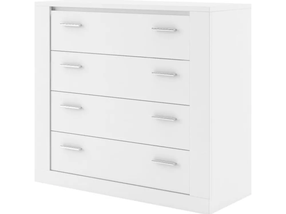 Komoda to niezastąpiony element każdej sypialni. Prezentowana wersja to konfiguracje z czterema pojemnymi szufladami. Takie zestawienie to gwarancja udanej organizacji wszystkich ubrań i rzeczy osobistych.