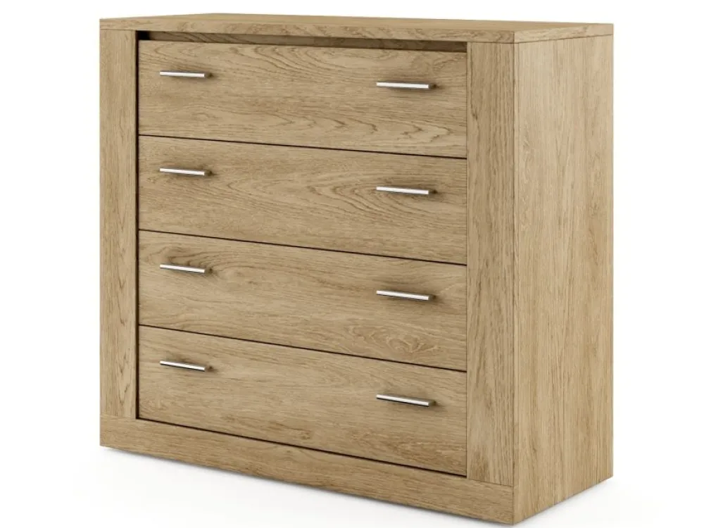 Komoda to niezastąpiony element każdej sypialni. Prezentowana wersja to konfiguracje z czterema pojemnymi szufladami. Takie zestawienie to gwarancja udanej organizacji wszystkich ubrań i rzeczy osobistych.