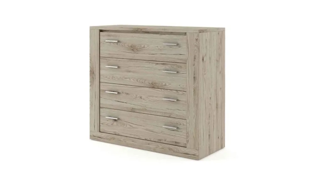 Komoda to niezastąpiony element każdej sypialni. Prezentowana wersja to konfiguracje z czterema pojemnymi szufladami. Takie zestawienie to gwarancja udanej organizacji wszystkich ubrań i rzeczy osobistych.