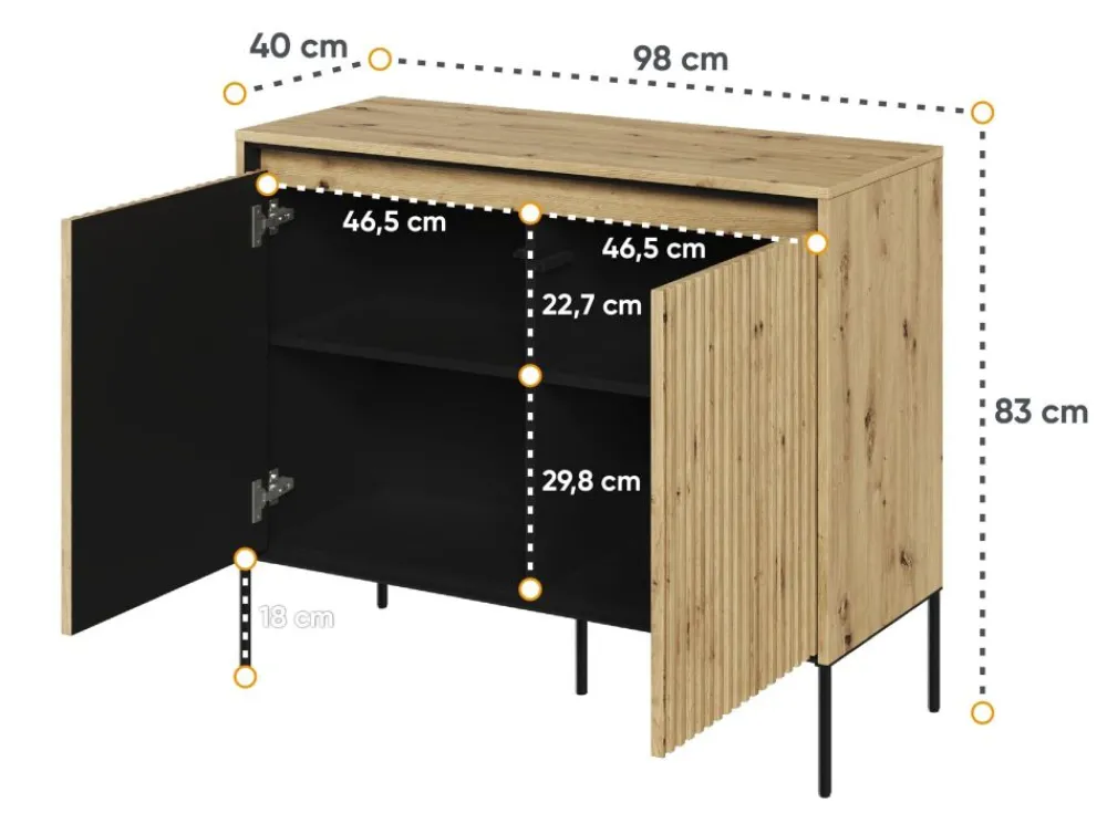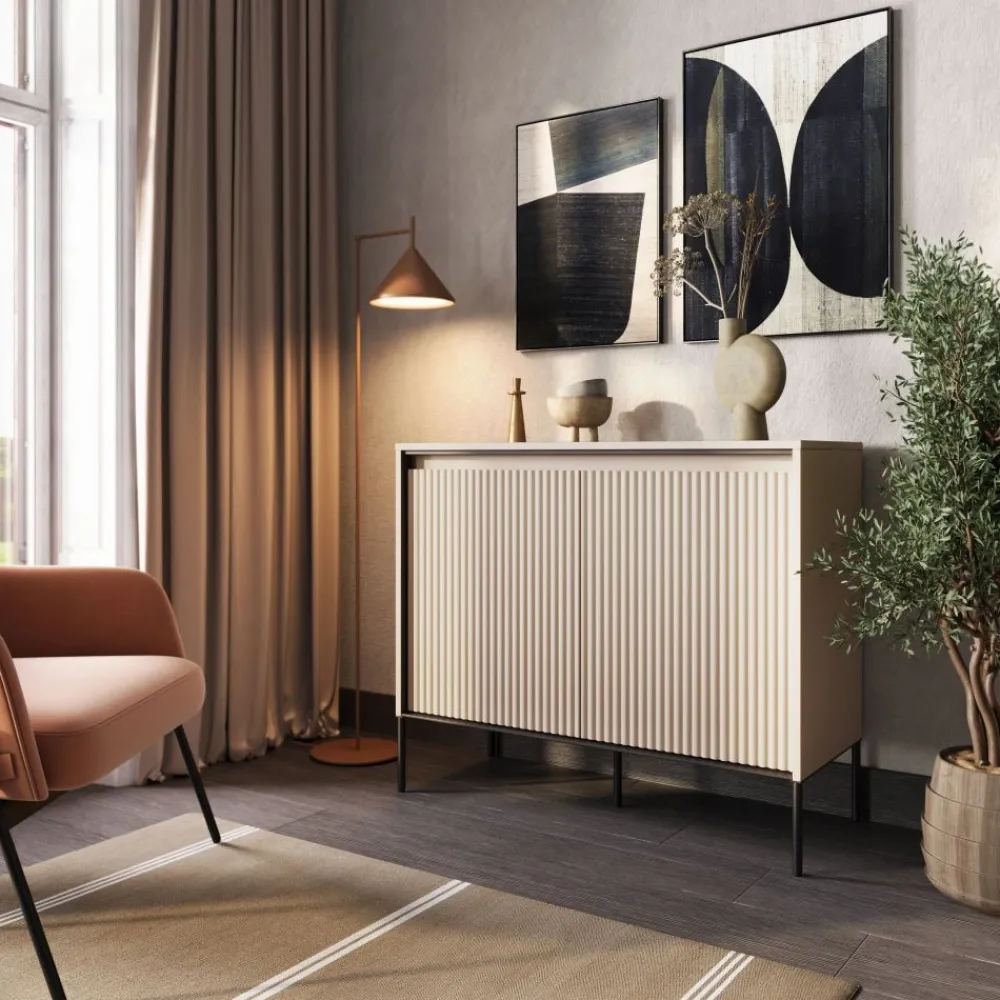 Ryflowane fronty są wyjątkowym elementem tej komody, dodającym jej niepowtarzalnego uroku i charakteru. To idealny wybór dla osób, które cenią oryginalny design i chcą dodać tekstury oraz stylu do swojej przestrzeni. Komoda jest podparta kontrastowymi czarnymi metalowymi nóżkami, które zapewniają stabilność i nadają jej nowoczesny wygląd. Dodatkowo, subtelne podświetlenie frontów w postaci paska ledowego doskonale dopełnia całość.
