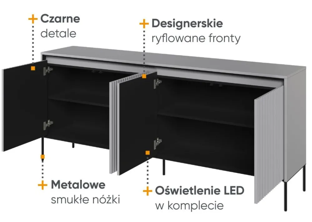 Komoda TR-04 została wykonana z wysokiej jakości materiałów, co zapewnia trwałość na lata. Ryflowane fronty zostały dodatkowo podkreślone przez dołączone w komplecie oświetlenie LED. Odkryj, jak wiele korzyści możesz czerpać z tego funkcjonalnego i designerskiego mebla. Uzupełnij swoją przestrzeń tym unikalnym meblem, który stanie się centralnym punktem w Twoim salonie. Nie tylko wzbogaci przestrzeń, lecz także nadaje jej wyjątkowy charakter.