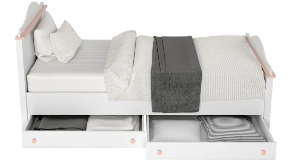 Jedną z propozycji z kolekcji jest łóżko z materacem. Wliczony w cenę materac gwarantuje pełen komfort dzięki sprężynom bonellowym oraz dużej powierzchni spania: 90×200. Idealnym rozszerzeniem zestawu może być: szafka nocna, skrzynia wielofunkcyjna lub praktyczna szuflada na pościel chowana pod łóżko.