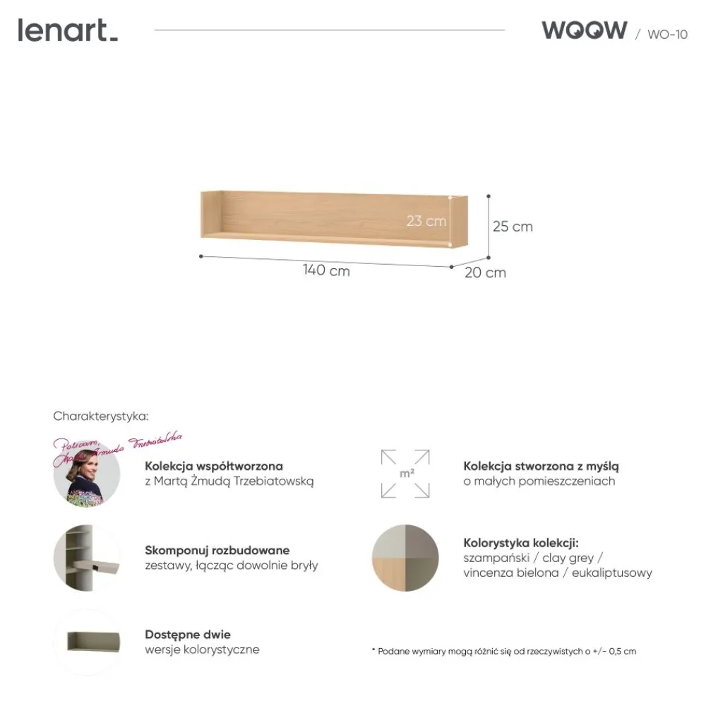 Półka ścienna WO-10 to doskonała półka wisząca do pokoju młodzieżowego, która pozwala w pełni wykorzystać przestrzeń ścienną. Dzięki niej zyskujesz miejsce na książki, dekoracje oraz przybory szkolne, bez zabierania powierzchni roboczej. To idealne rozwiązanie dla nastolatków, którzy potrzebują uporządkowanej i stylowej przestrzeni do nauki. Jej nowoczesny design i kolor dąb vincenza bielona świetnie komponują się z aktualnymi trendami. Półka do pokoju nastolatka z serii Woow jest estetyczna, lekka wizualnie i bardzo praktyczna. To również idealna półka do małego pokoju, która zwiększa funkcjonalność bez zajmowania dodatkowego miejsca.