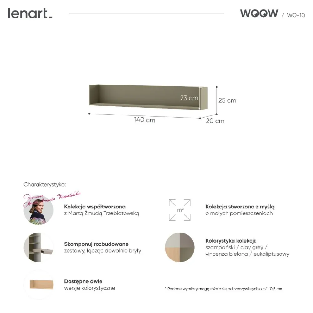 Półka ścienna WO-10 to doskonała półka wisząca do pokoju młodzieżowego, która pozwala w pełni wykorzystać przestrzeń ścienną. Dzięki niej zyskujesz miejsce na książki, dekoracje oraz przybory szkolne, bez zabierania powierzchni roboczej. To idealne rozwiązanie dla nastolatków, którzy potrzebują uporządkowanej i stylowej przestrzeni do nauki. Jej nowoczesny design i kolor eukaliptus świetnie komponują się z aktualnymi trendami. Półka do pokoju nastolatka z serii Woow jest estetyczna, lekka wizualnie i bardzo praktyczna. To również idealna półka do małego pokoju, która zwiększa funkcjonalność bez zajmowania dodatkowego miejsca.