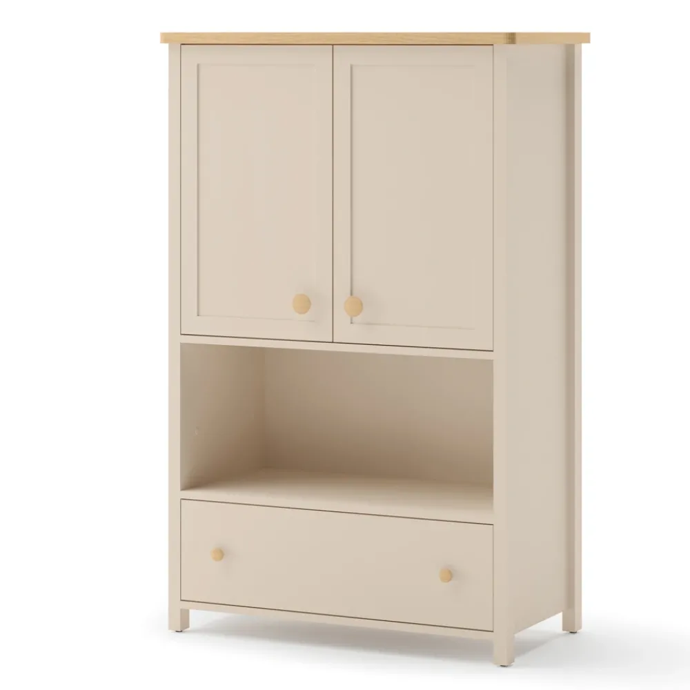 Komoda do pokoju dziecka Lenart Story SO-11 to mebel, który łączy elegancję i praktyczne rozwiązania. Dzięki wysokiej konstrukcji oferuje więcej miejsca do przechowywania bez zajmowania dużej powierzchni. To komoda z szufladami i szafką, w której zmieścisz ubrania, bieliznę czy akcesoria. Dodatkowa otwarta półka pozwala na ustawienie książek, dekoracji lub pamiątek. Neutralna kolorystyka beż piaskowy/dąb vincenza bielona sprawia, że mebel pasuje do nowoczesnych i klasycznych aranżacji. Wysoka jakość wykonania zapewnia trwałość na lata. To doskonały wybór do pokoju dziecka i nastolatka.