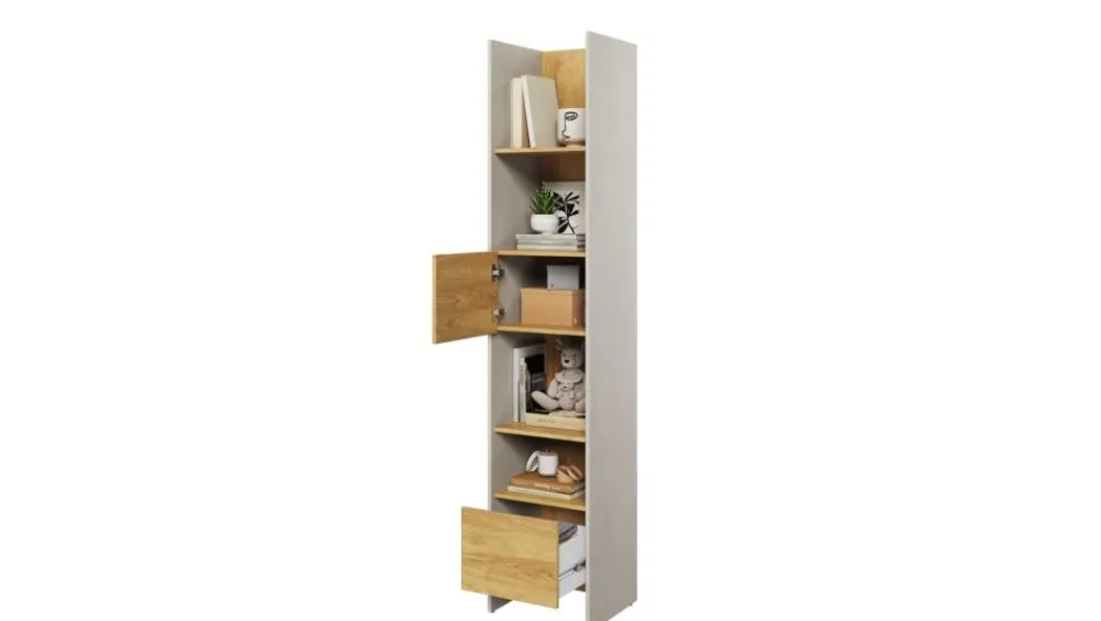 Regały są meblami, które zapewniają świetny sposób na przechowywanie różnych rzeczy w pokoju nastolatków. Wykorzystując te meble ułatwisz sobie oraz użytkownikowi utrzymywanie porządku, ale również w ciekawy sposób eksponujesz pamiątki, dekoracje, książki oraz płyty z muzyką lub filmami. Regał TF-2, który zawiera szafkę i półki to niezwykle designerska propozycja dla tych osób, które lubią nieoczywiste połączenia otwartej i zamkniętej przestrzeni. Mebel w pokoju nastolatka nie tylko powinien być modny, ale co najważniejsze funkcjonalny. Kolekcja mebli Teen Flex została zaprojektowana z myślą o pokojach młodzieżowych i wyróżniają się możliwością łączenia brył w różne zestawy co daje szerokie pole manewru w kwestii aranżacji wnętrza.