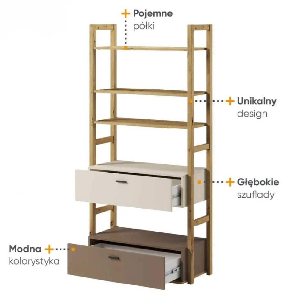 Regał jest wyposażony w półki oraz szuflady, co pozwala na przechowywanie i porządkowanie książek, notesów, ubrań, czy innych drobiazgów, które są ważne w życiu młodzieży. Dzięki dużej pojemności mebel pozwoli na utrzymanie porządku w pokoju, a jednocześnie będzie cennym elementem dekoracyjnym.