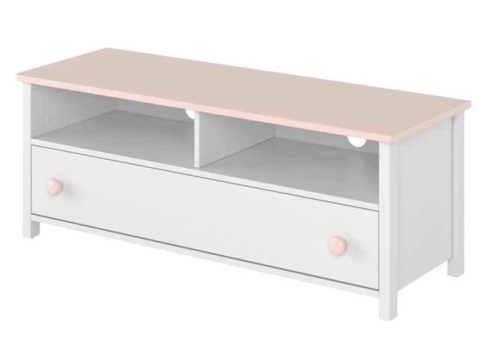 Jedną z propozycji z kolekcji jest szafka RTV z dodatkowymi wnękami i pojemną szufladą. Mebelek idealny na pierwszy telewizor, jest też miejsce na ustawienie konsoli / odtwarzacza DVD lub innych podobnych urządzeń. Wnęki posiadają specjalne otwory na kable. Funkcjonalność zwiększa szuflada, która pomieści potrzebne akcesoria, gry lub filmy.