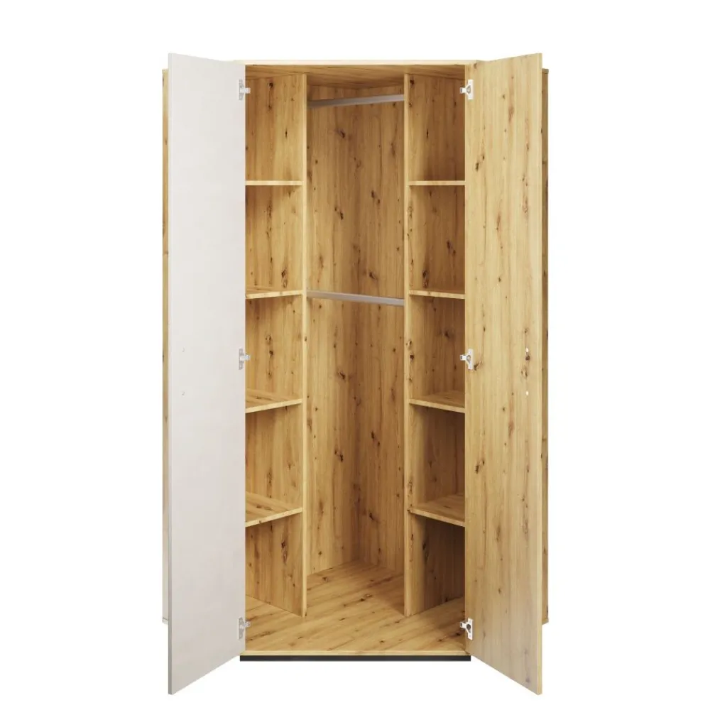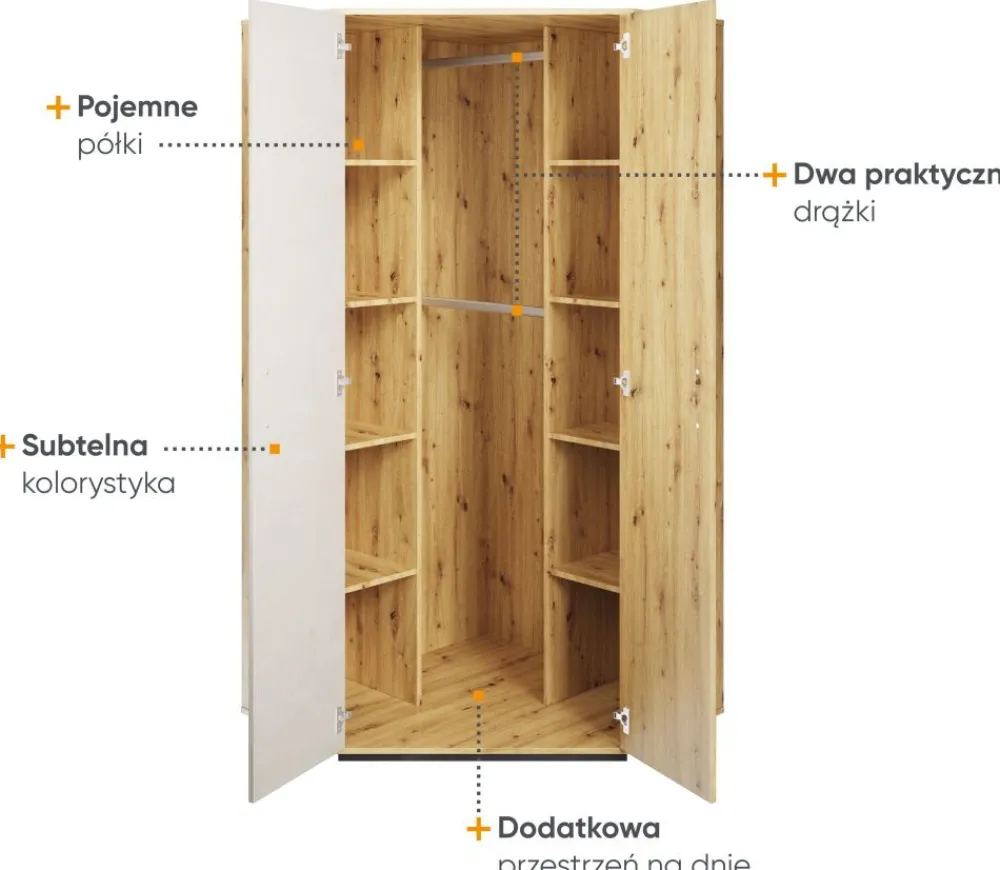 W kolekcji QUBIC znaleźć można kilka wariantów szaf, które dzięki sprytnym rozwiązaniom projektowym doskonale zagospodarują przestrzeń przeznaczoną do przechowania ubrań. Jedną z propozycji jest pojemna szafa narożna. Wnętrze wyposażone jest w dwa drążki i zestaw półek po lewej i prawej stronie, na których pomieścimy na prawdę dużo rzeczy. Szafy narożne od zawsze stanowiły podstawę w praktycznym wykorzystaniu kątów pomieszczenia, tym bardziej, że po dostawieniu do niej innych elementów kolekcji, stworzymy solidną i estetyczną strefę przechowania.