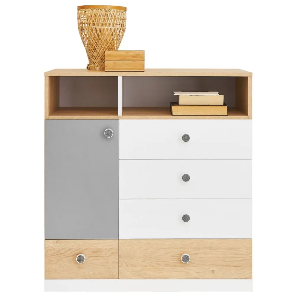 Komoda została zaprojektowana tak, aby doskonale pasować do nowoczesnych wnętrz pokoju młodzieżowego. Jej fronty w kolorach biały lux, szary i dąb biszkoptowy nadają meblowi wyjątkowego charakteru, który łączy elegancję z modnym stylem. Kolor dąb biszkoptowy dodaje ciepła i naturalności, co wprowadza przytulną atmosferę do pokoju nastolatka. Dzięki nowoczesnej kolorystyce, komoda świetnie komponuje się z różnorodnymi dodatkami i aranżacjami, co sprawia, że można ją łatwo dopasować do zmieniającego się gustu młodej osoby. To mebel, który nie tylko jest praktyczny, ale również pięknie wygląda, stanowiąc ozdobę każdego pokoju młodzieżowego.