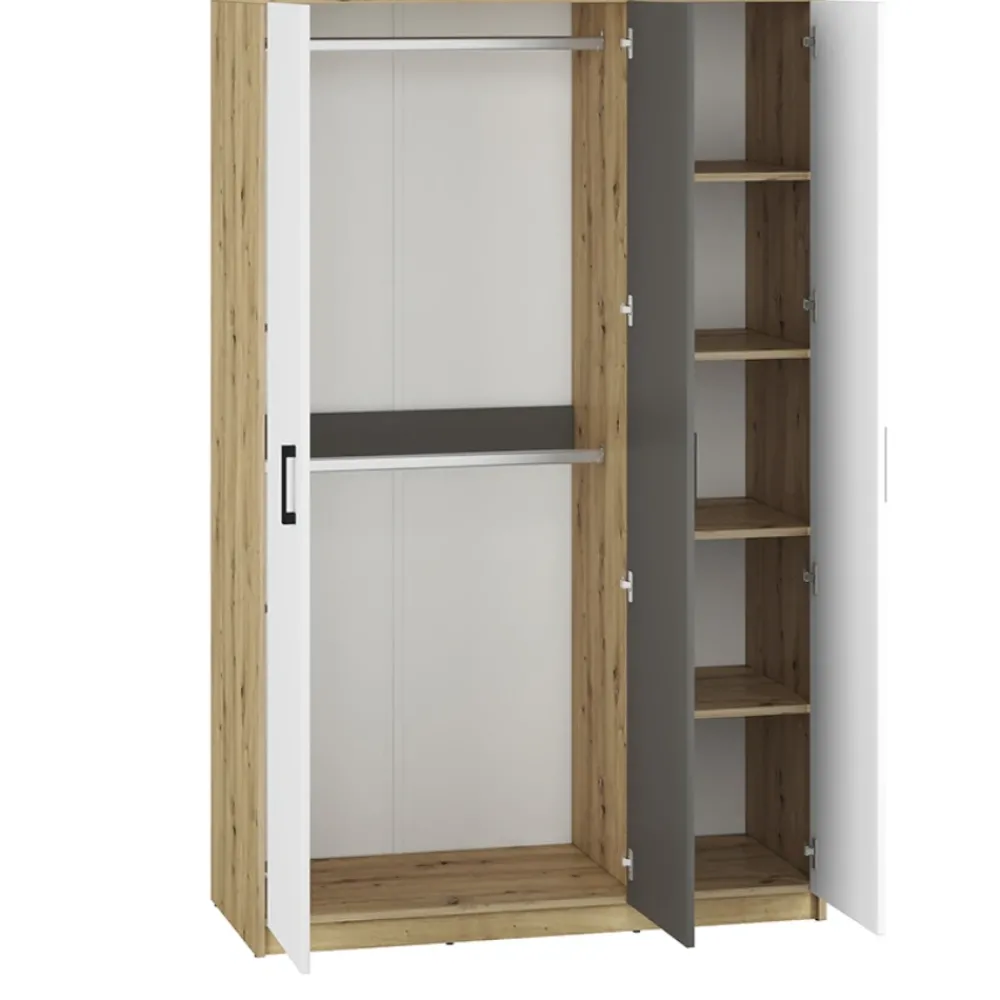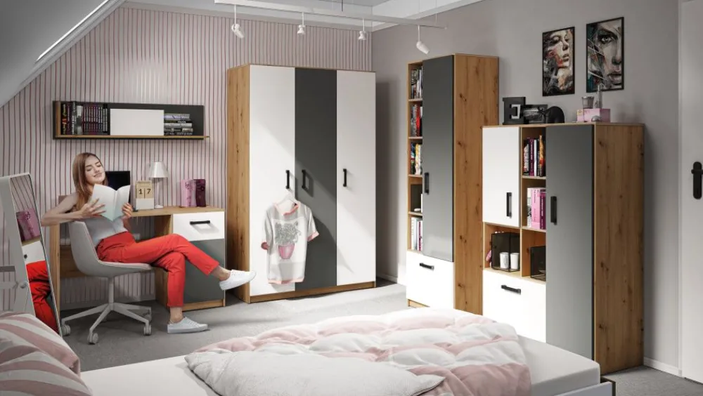 Trzydrzwiowa szafa FINI 02 to funkcjonalny mebel zaprojektowany z myślą o pokoju młodzieżowym. Duża pojemność pozwala wygodnie przechowywać zarówno ubrania codzienne, jak i sezonowe. Przemyślana konstrukcja sprawia, że wszystko ma swoje miejsce i jest łatwo dostępne. Dzięki temu utrzymanie porządku staje się prostsze nawet przy intensywnym użytkowaniu. To szafa, która realnie wspiera codzienną organizację przestrzeni nastolatka.