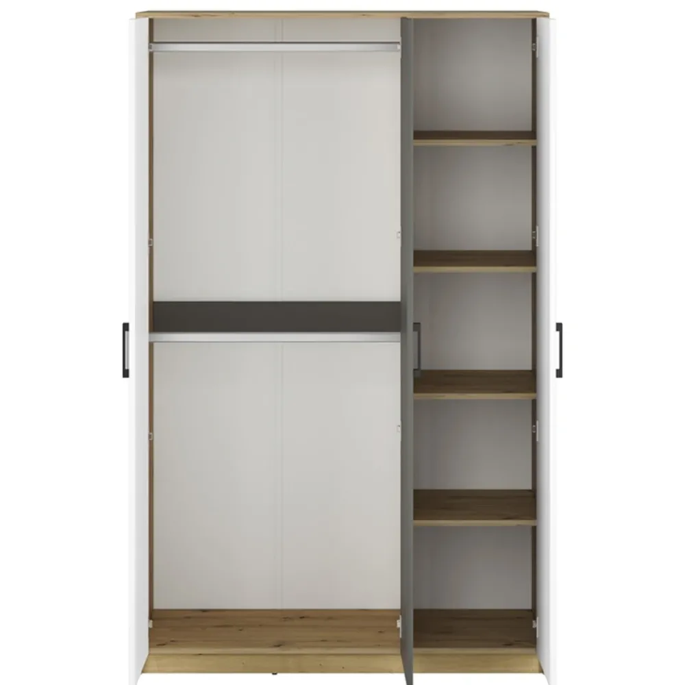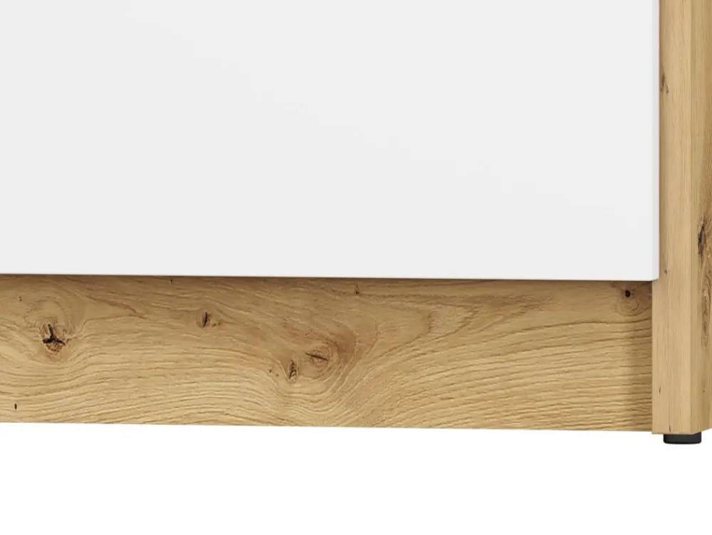 Fronty szafy w kolorach białym i antracytowym idealnie współgrają z korpusem w dekorze dąb artisan, tworząc nowoczesną i młodzieżową stylistykę. Mebel wykonano z wysokiej jakości płyty laminowanej, odpornej na zarysowania, wilgoć oraz wysoką temperaturę. Zastosowane obrzeża ABS skutecznie chronią krawędzie przed uszkodzeniami mechanicznymi. Solidne wykonanie gwarantuje stabilność i bezpieczeństwo użytkowania. Wybierając szafę FINI 02, inwestujesz w mebel, który zachowa swój wygląd i funkcjonalność przez lata.