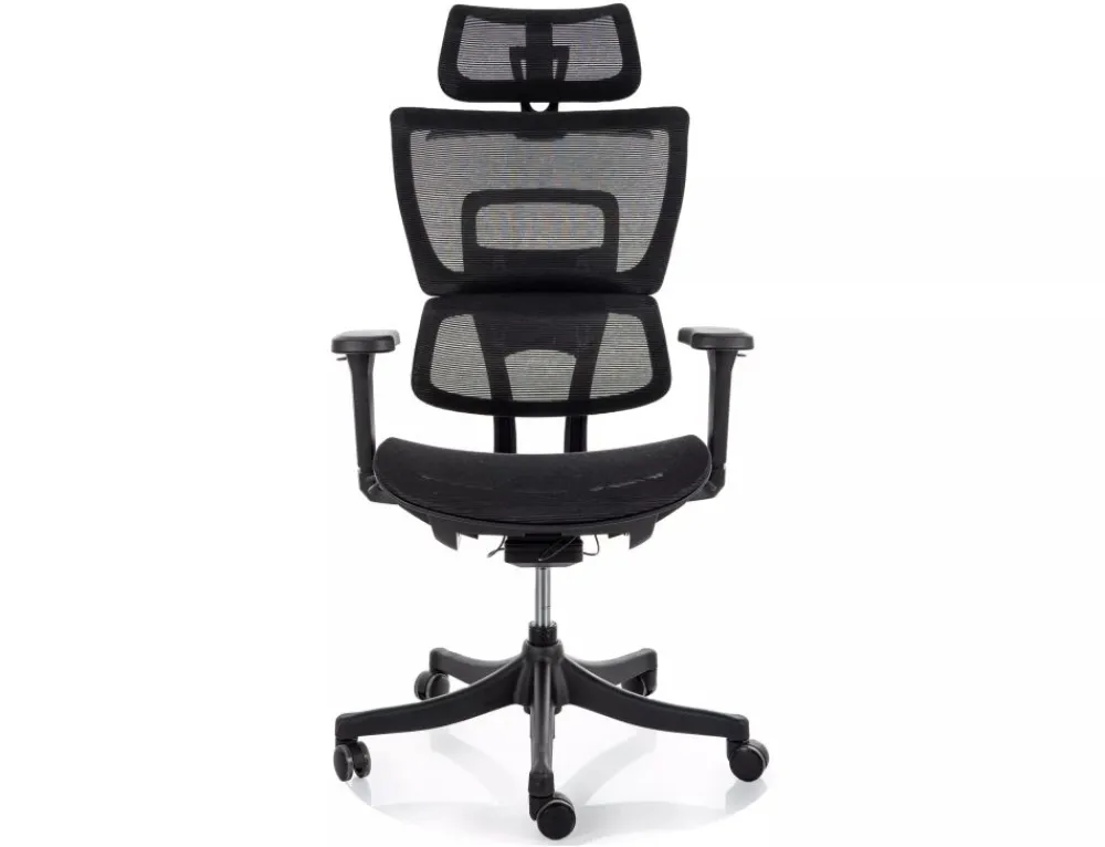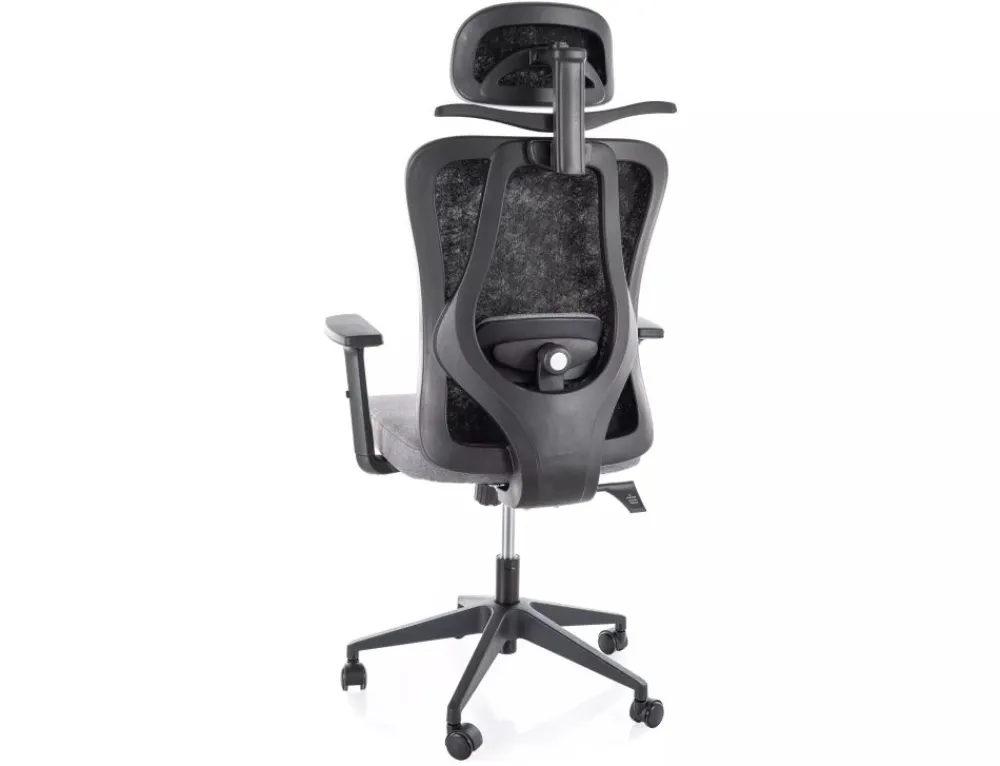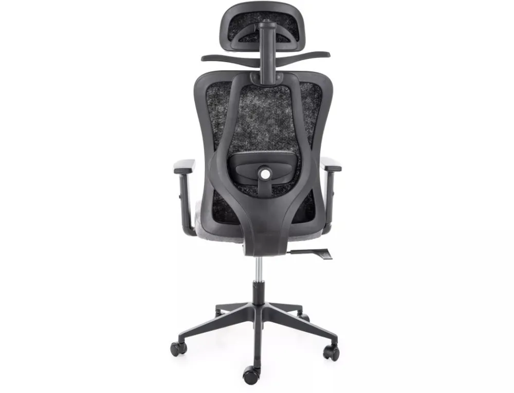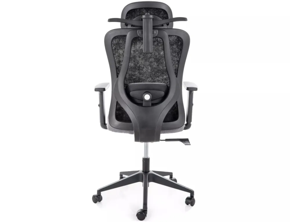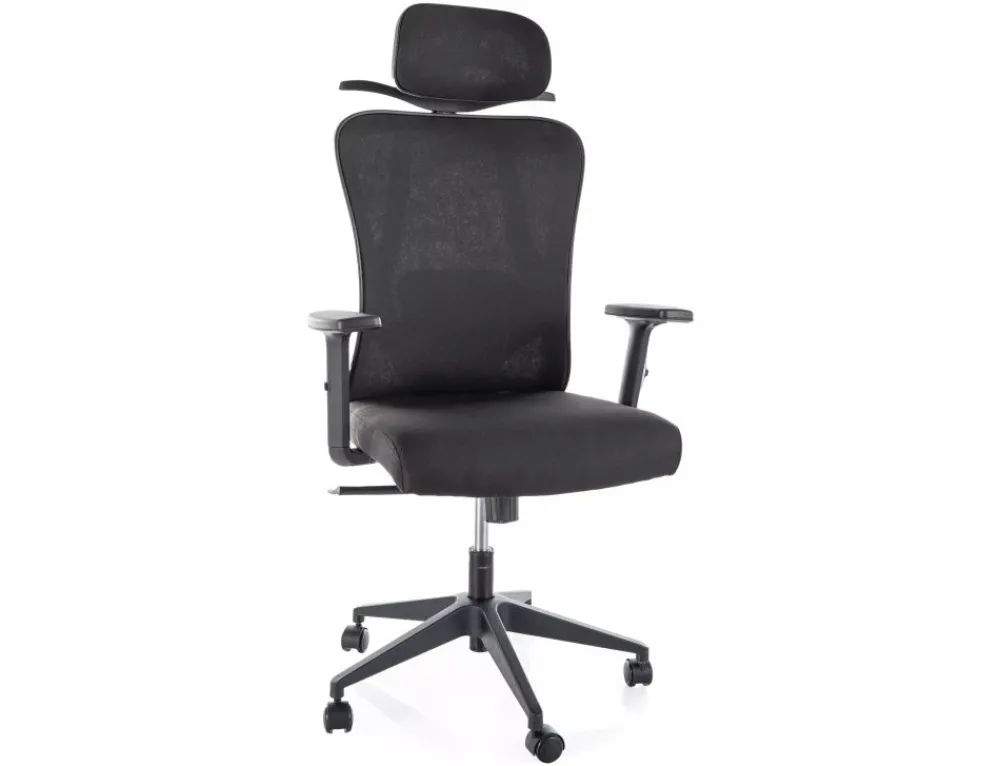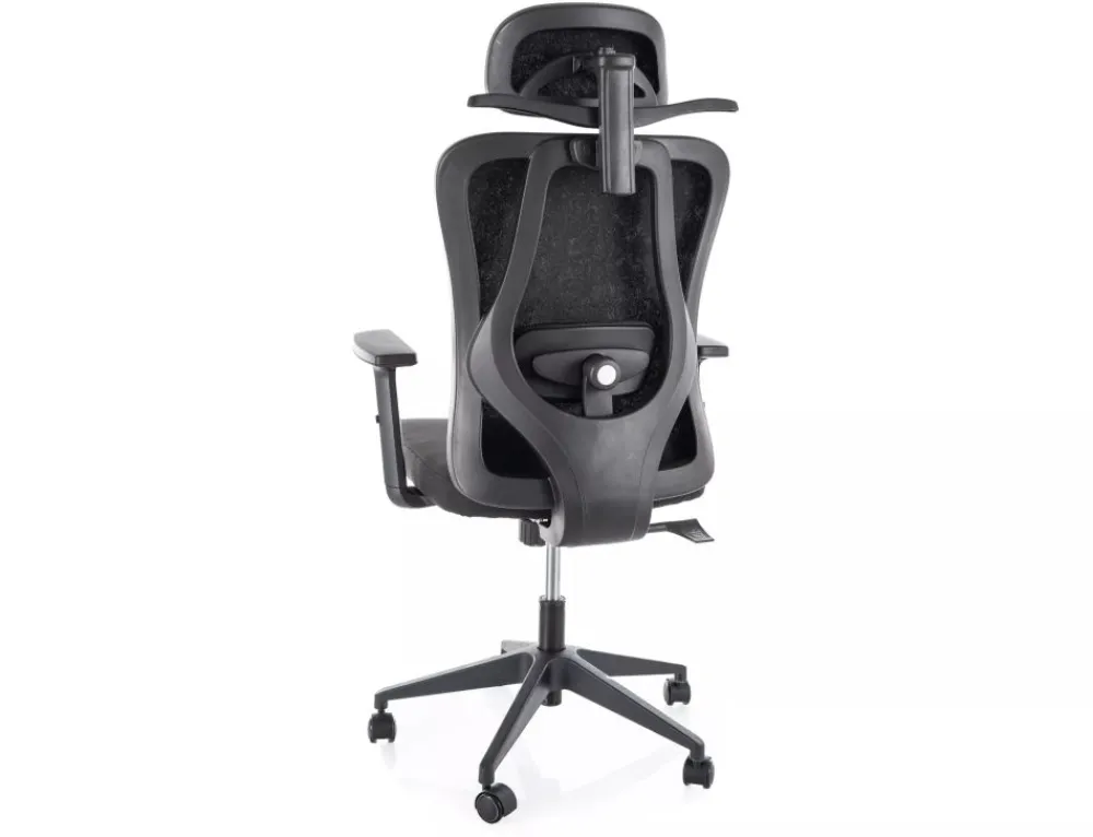 Fotel obrotowy ergonomiczny, spełnia wymogi BHP dotyczące krzeseł biurowych zgodnie z rozporządzeniem Dz. U. poz.2367. Tkanina, kolor: czarny, mechanizm TILT, multiblock, regulowane podłokietniki, odcinek lędźwiowy oraz zagłówek. Na zwieńczeniu oparcia fotel posiada praktyczny wieszak na marynarkę / żakiet.