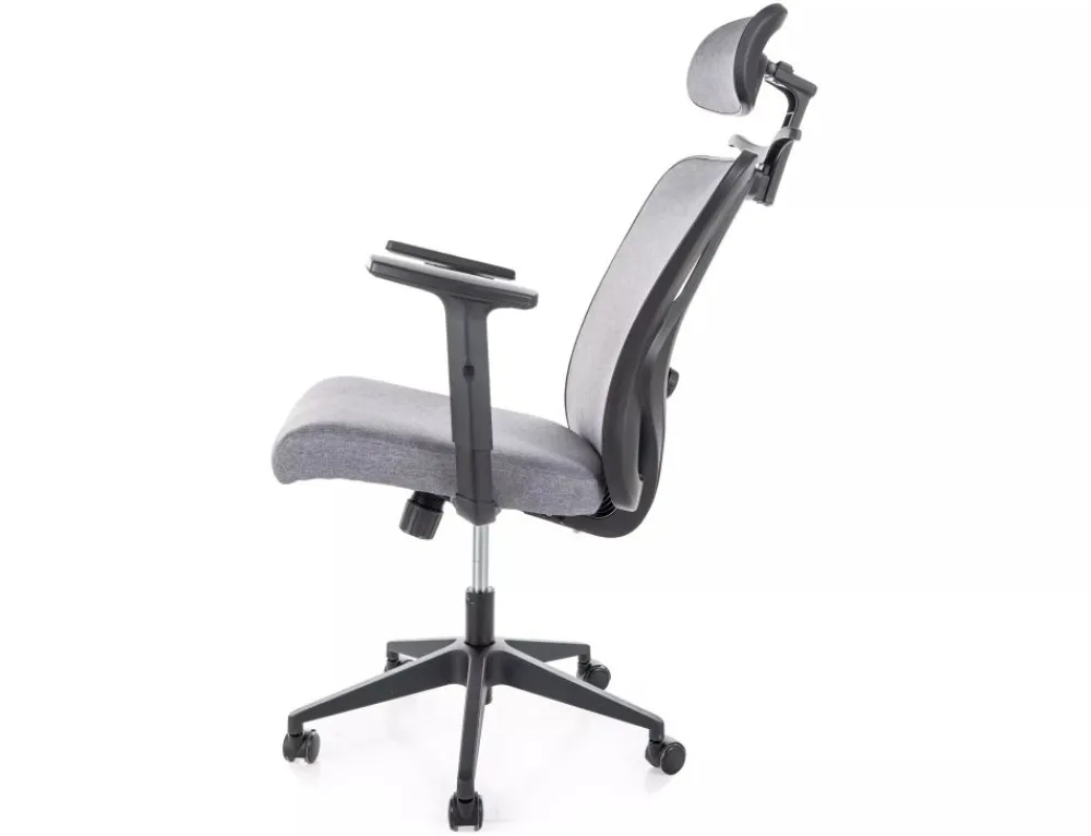 Fotel obrotowy ergonomiczny, spełnia wymogi BHP dotyczące krzeseł biurowych zgodnie z rozporządzeniem Dz. U. poz.2367. Tkanina, kolor: szary, mechanizm TILT, multiblock, regulowane podłokietniki, odcinek lędźwiowy oraz zagłówek. Na zwieńczeniu oparcia fotel posiada praktyczny wieszak na marynarkę / żakiet.