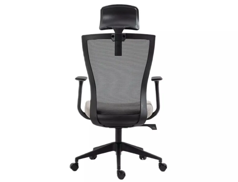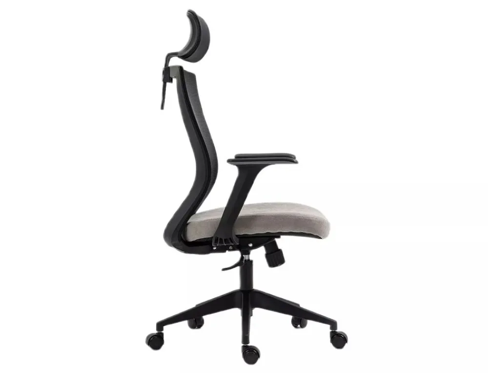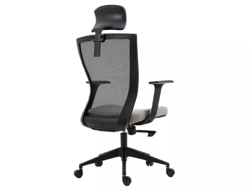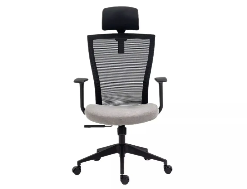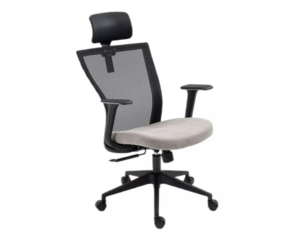 Fotel obrotowy, tkanina / siatka, kolor: szary / czarny, stelaż tworzywo, kolor: czarny, multiblock, stałe podłokietniki, regulowany zagłówek.