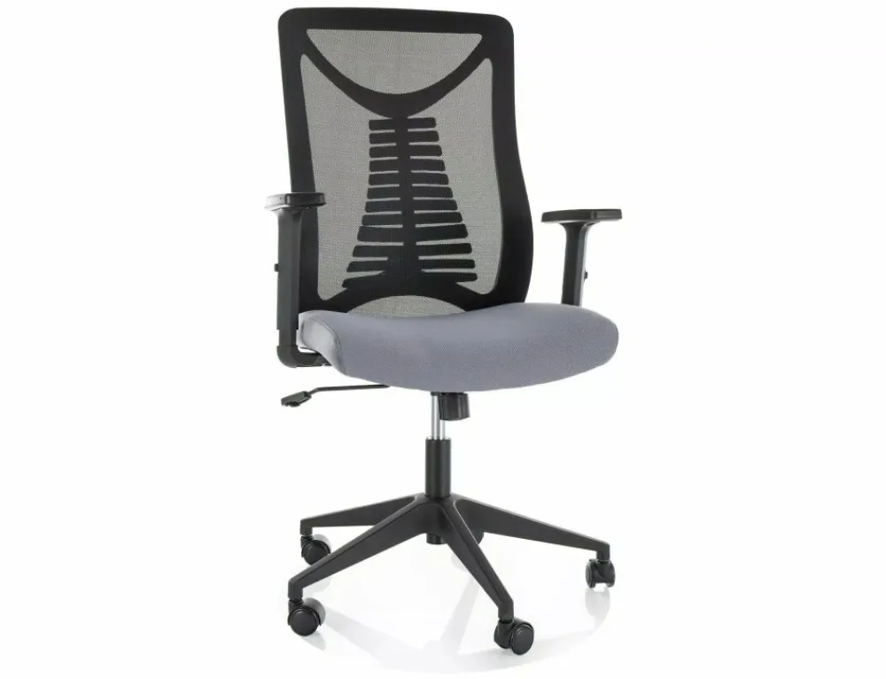 Fotel obrotowy, tapicerka: tkanina + siatka, stelaż: tworzywo, kolor: szary / czarny. Mechanizm TILT, regulowane podłokietniki.