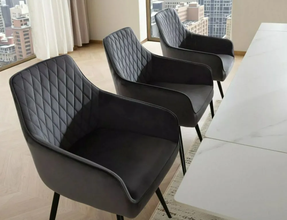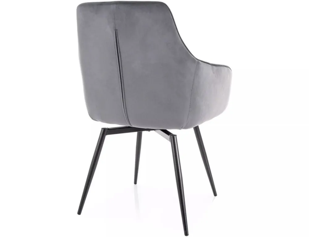 Krzesło, tapicerka: tkanina aksamit: Bluvel 14, stelaż: metal, kolor: szary / czarny mat.Funkcja auto-return – siedzisko obracane w zakresie 180st, z funkcją powrotu do pierwotnej pozycji. Sprężyny kieszeniowe w siedzisku.
