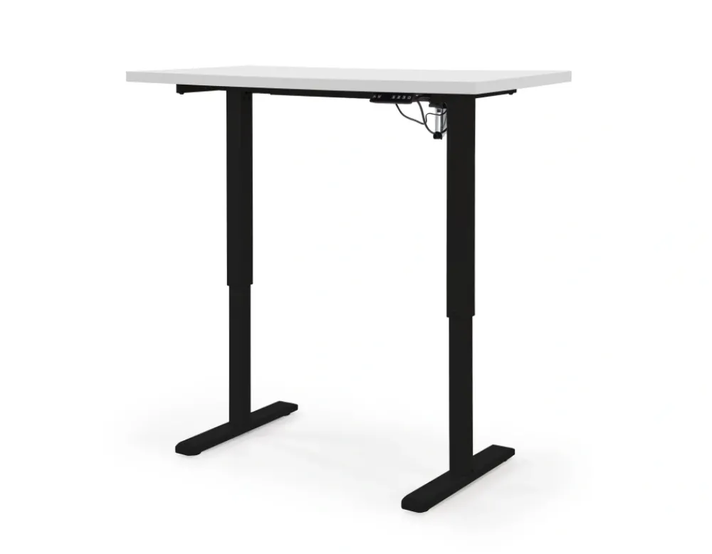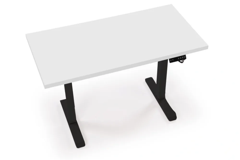 wymiary: 120/60/75-120 cm, biurko z funkcją regulacji wysokości, materiał: płyta meblowa laminowana / stal malowana proszkow, kolory: blat – biały, stelaż – czarny