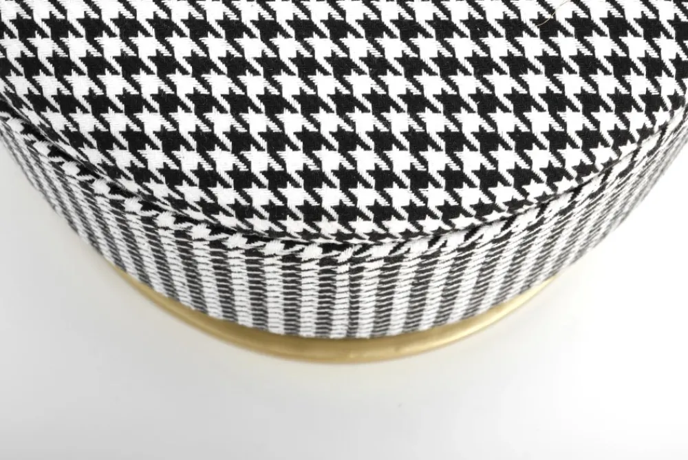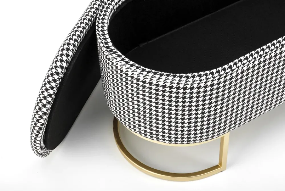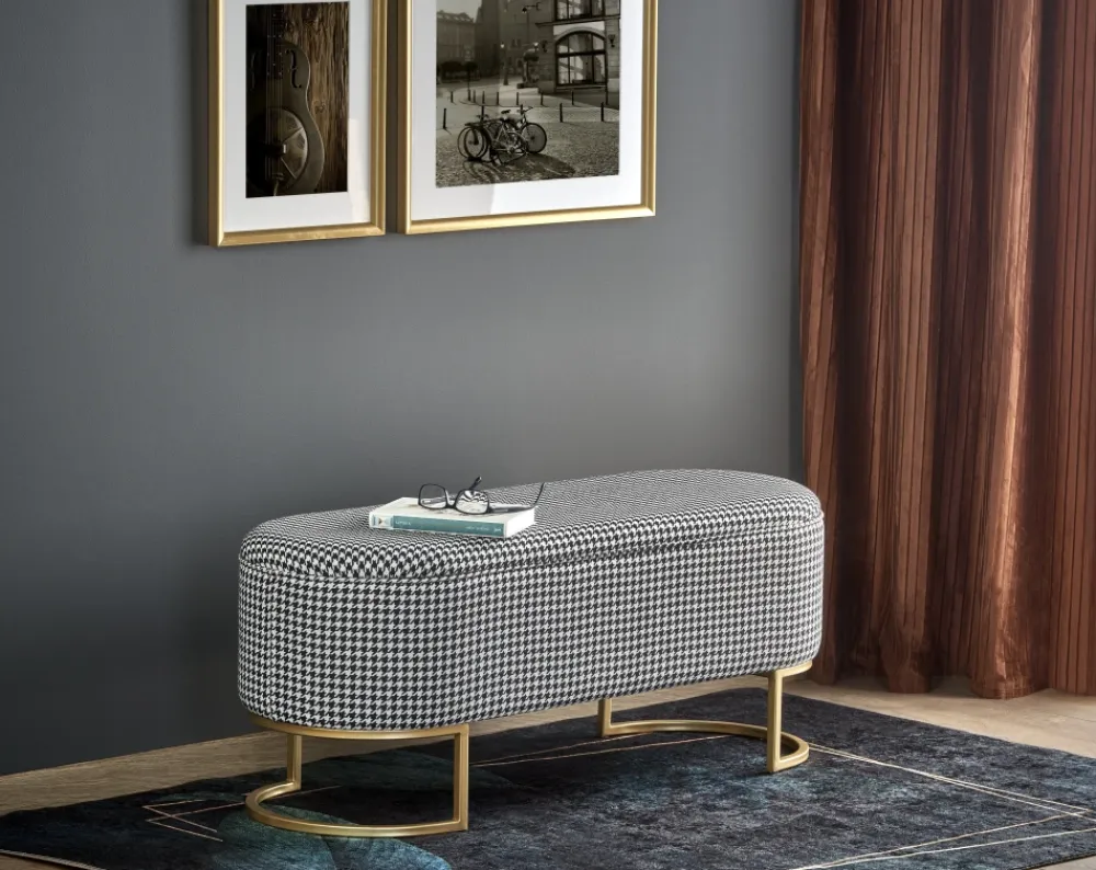 ławka z funkcją pojemnika, wymiary: 105/40/42 cm, materiał: tkanina / stal malowana proszkowo, kolor: czarny – biały – złoty