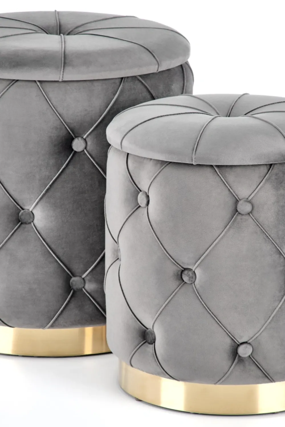 wymiary: 40/44 oraz 33/38 cm, zestaw 2 puf, materiał: tkanina / stal chromowana, kolor: popielaty / złoty