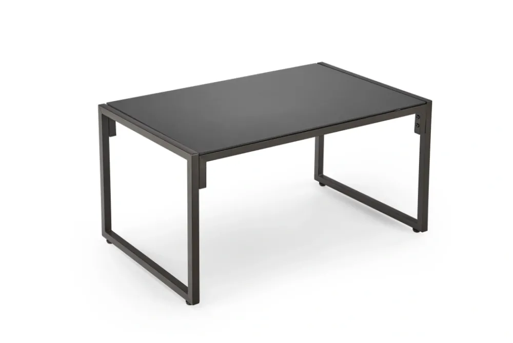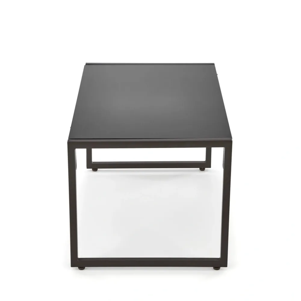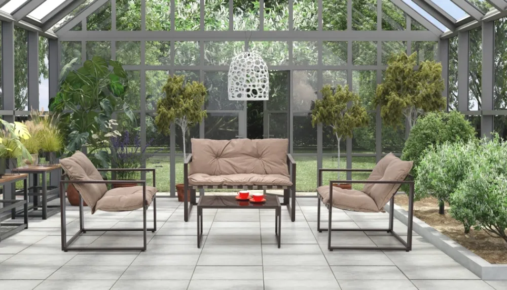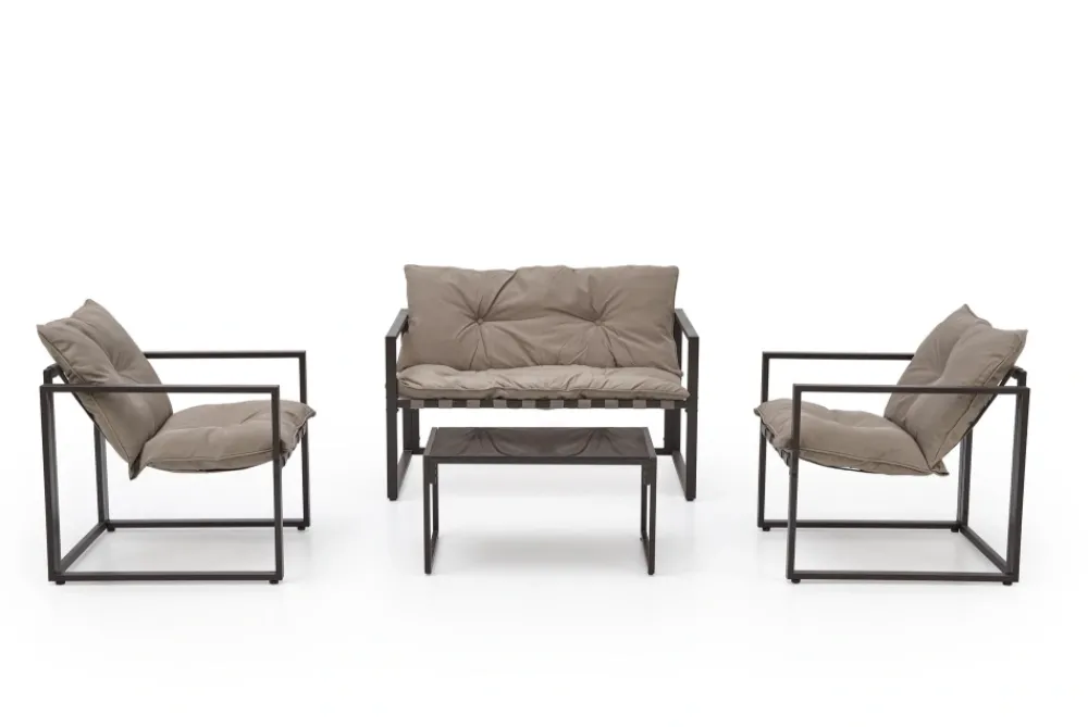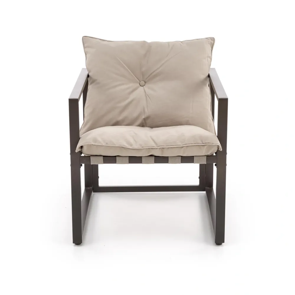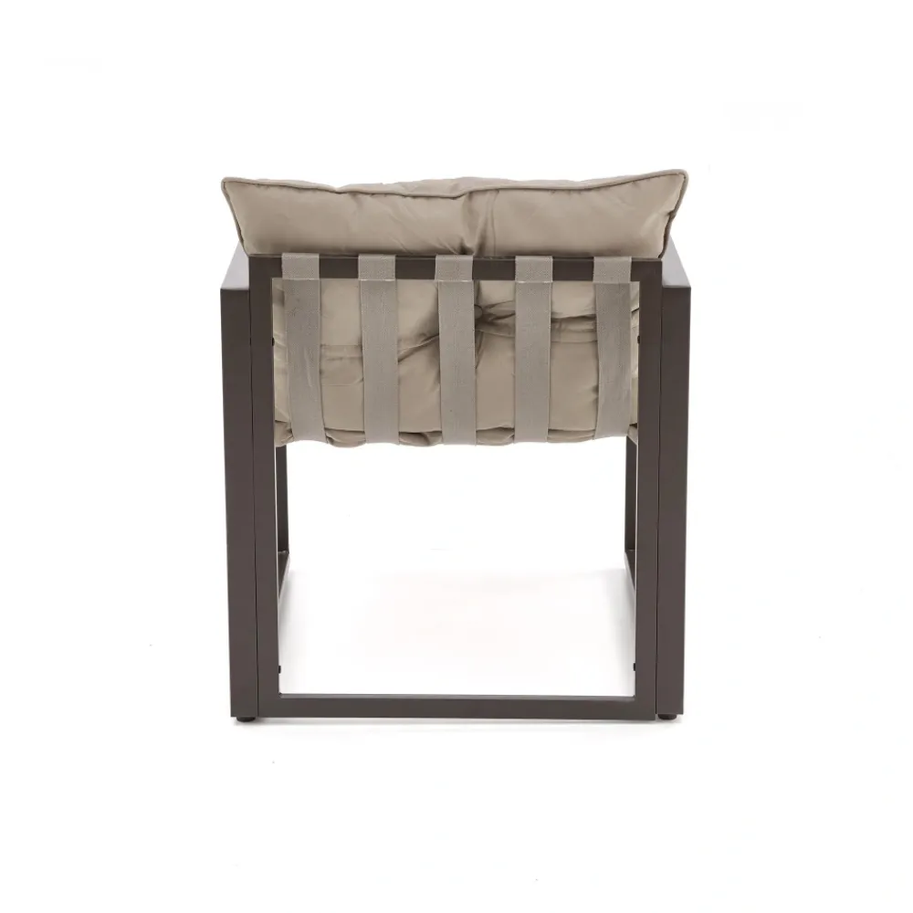 zestaw ogrodowy ( sofa + fotel 2x + ława ), wymiary: 118/74/68/41 cm (sofa), 65/74/68/41 cm (fotel), 75/45/40 cm (ława), materiał: stal malowana proszkowo / szkło / tkanina, kolor: ciemny brąz – cappuccino