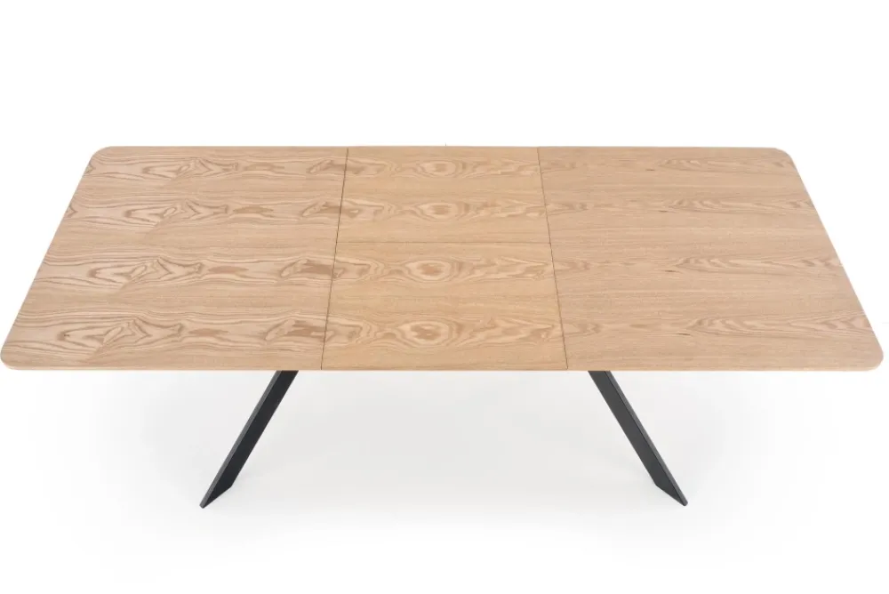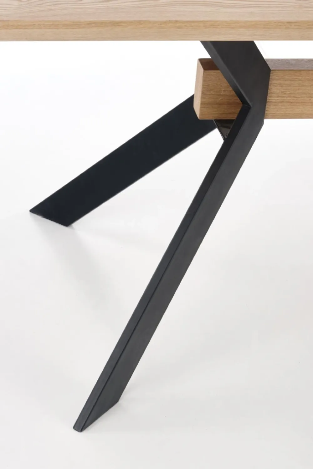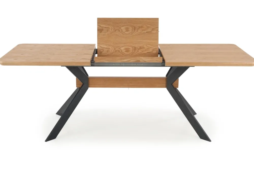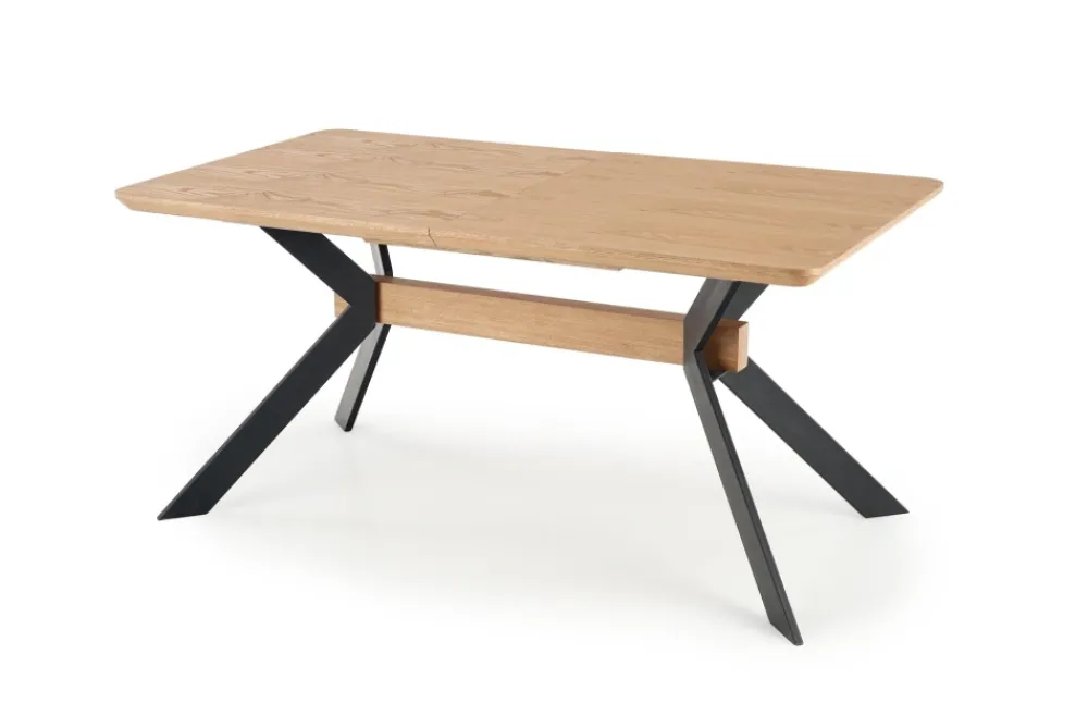 stół rozkładany, wymiary: 160-220/90/76 cm, materiał: MDF + okleina naturalna / stal malowana proszkowo, kolor: blat – dąb naturalny, nogi – czarny