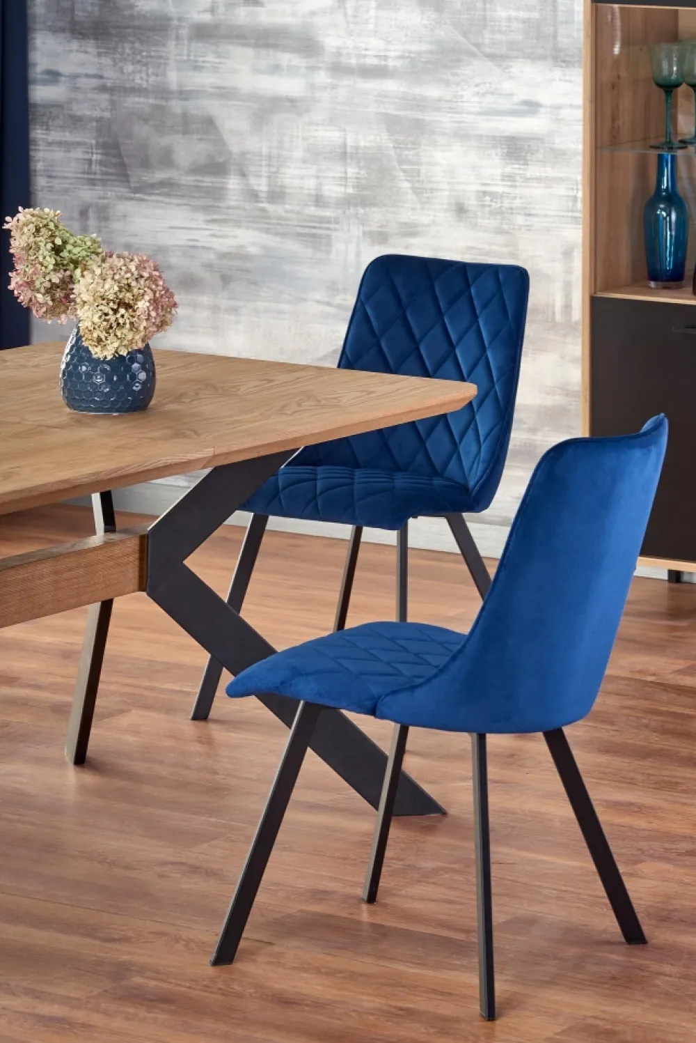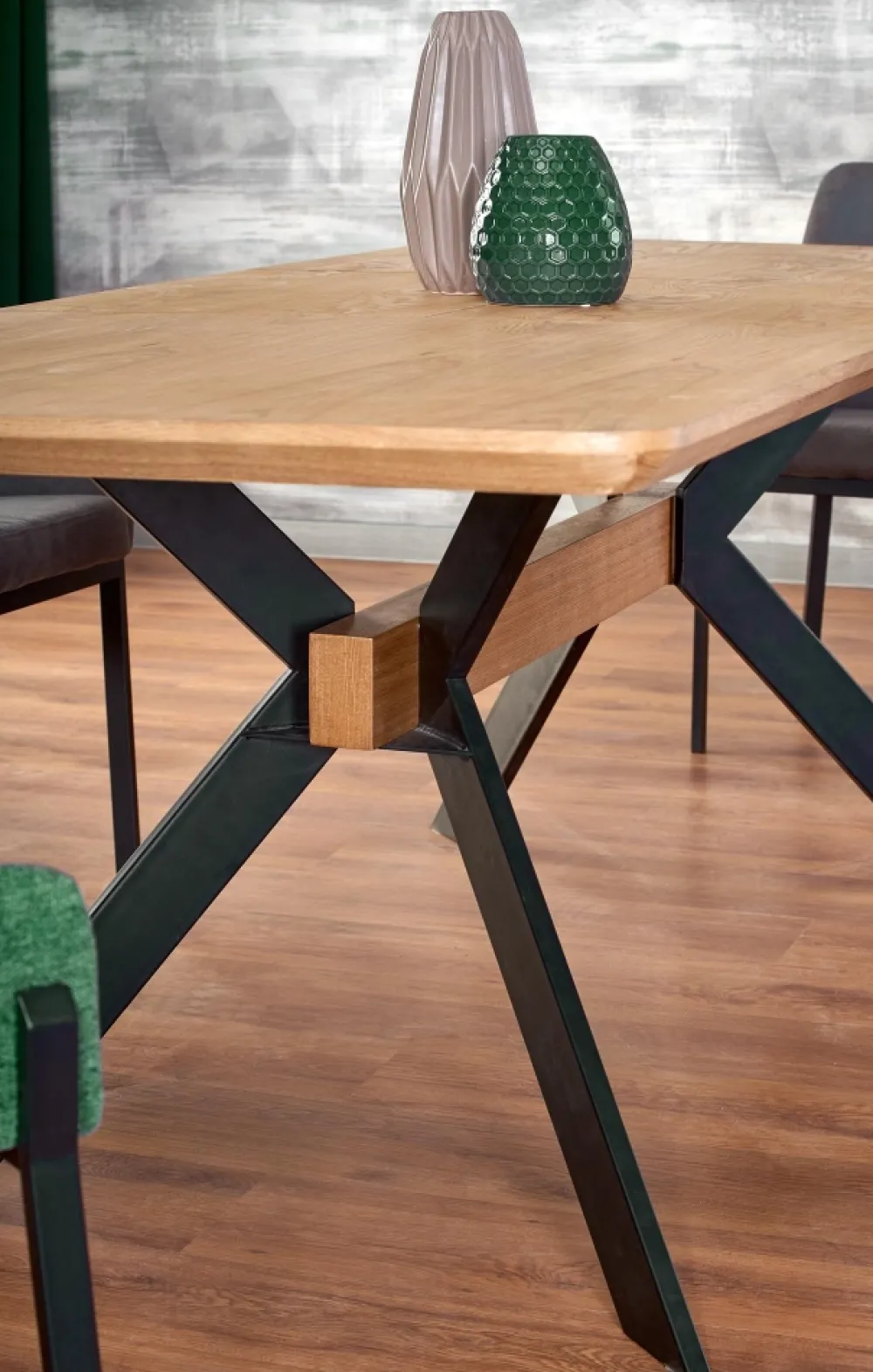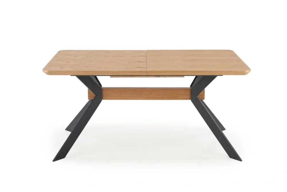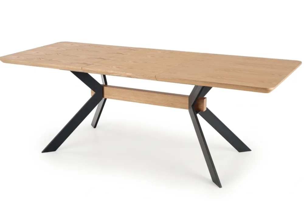 stół rozkładany, wymiary: 160-220/90/76 cm, materiał: MDF + okleina naturalna / stal malowana proszkowo, kolor: blat – dąb naturalny, nogi – czarny
