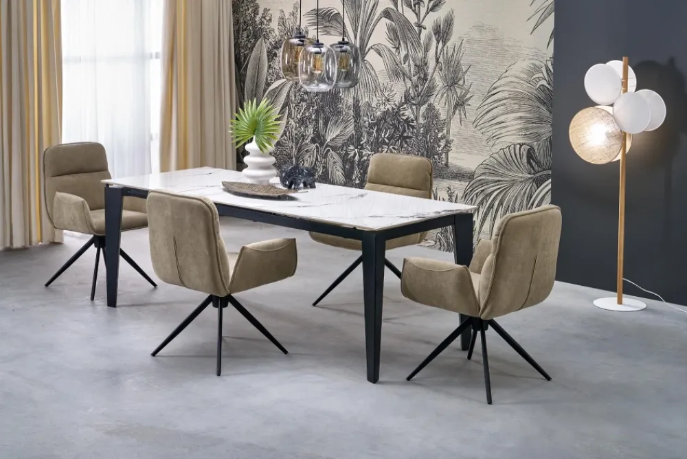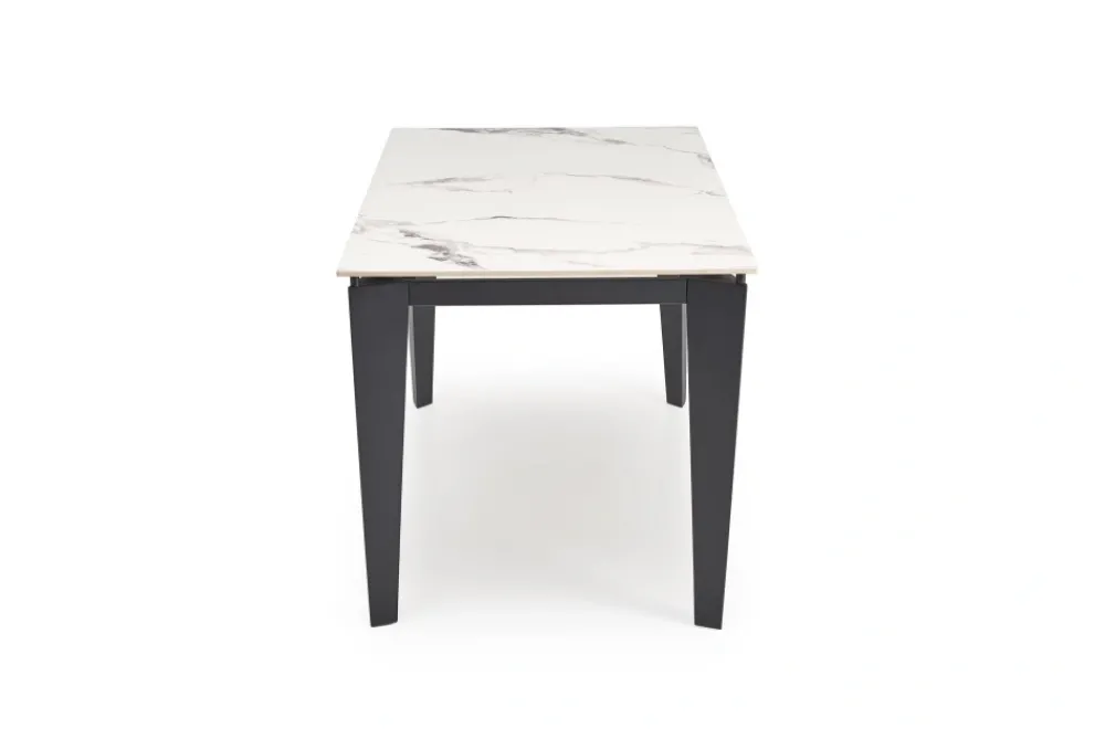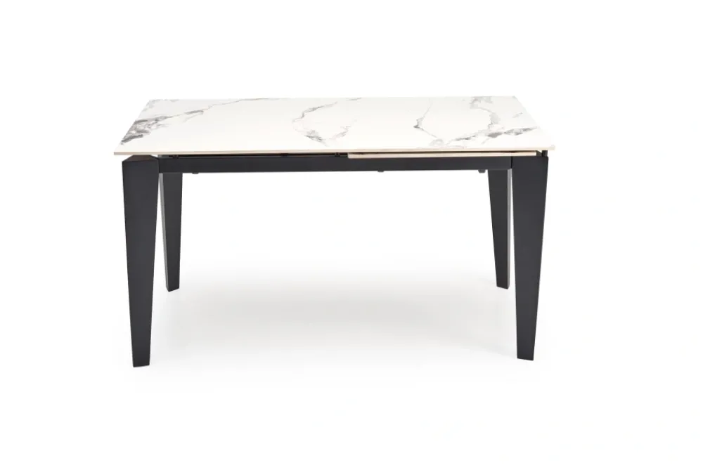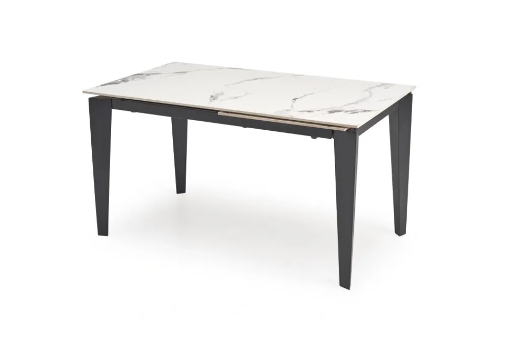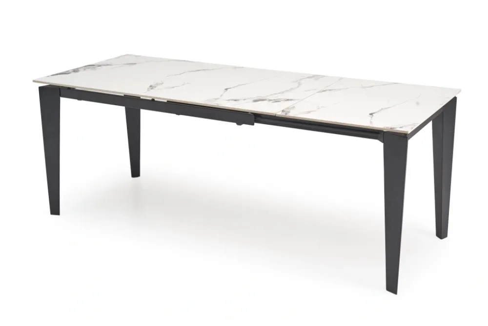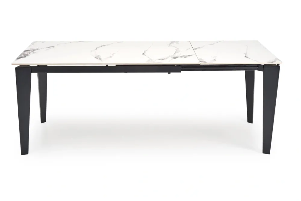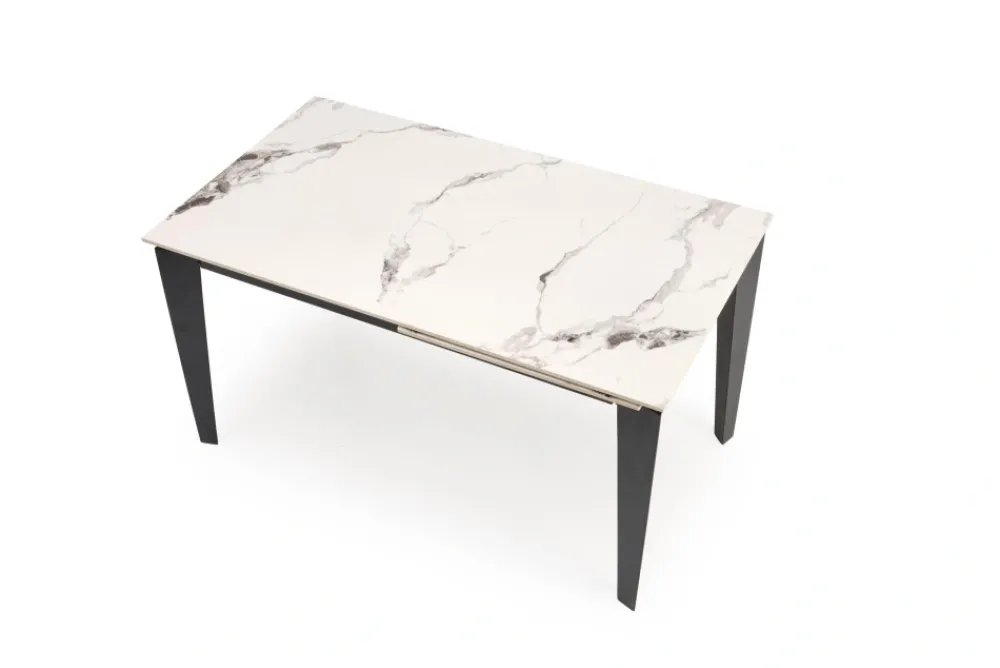 wymiary: 141-201/81/76/124-184 cm; stół rozkładany, materiał: spiek / stal malowana proszkowo, kolor: blat – biały marmur, nogi – czarny