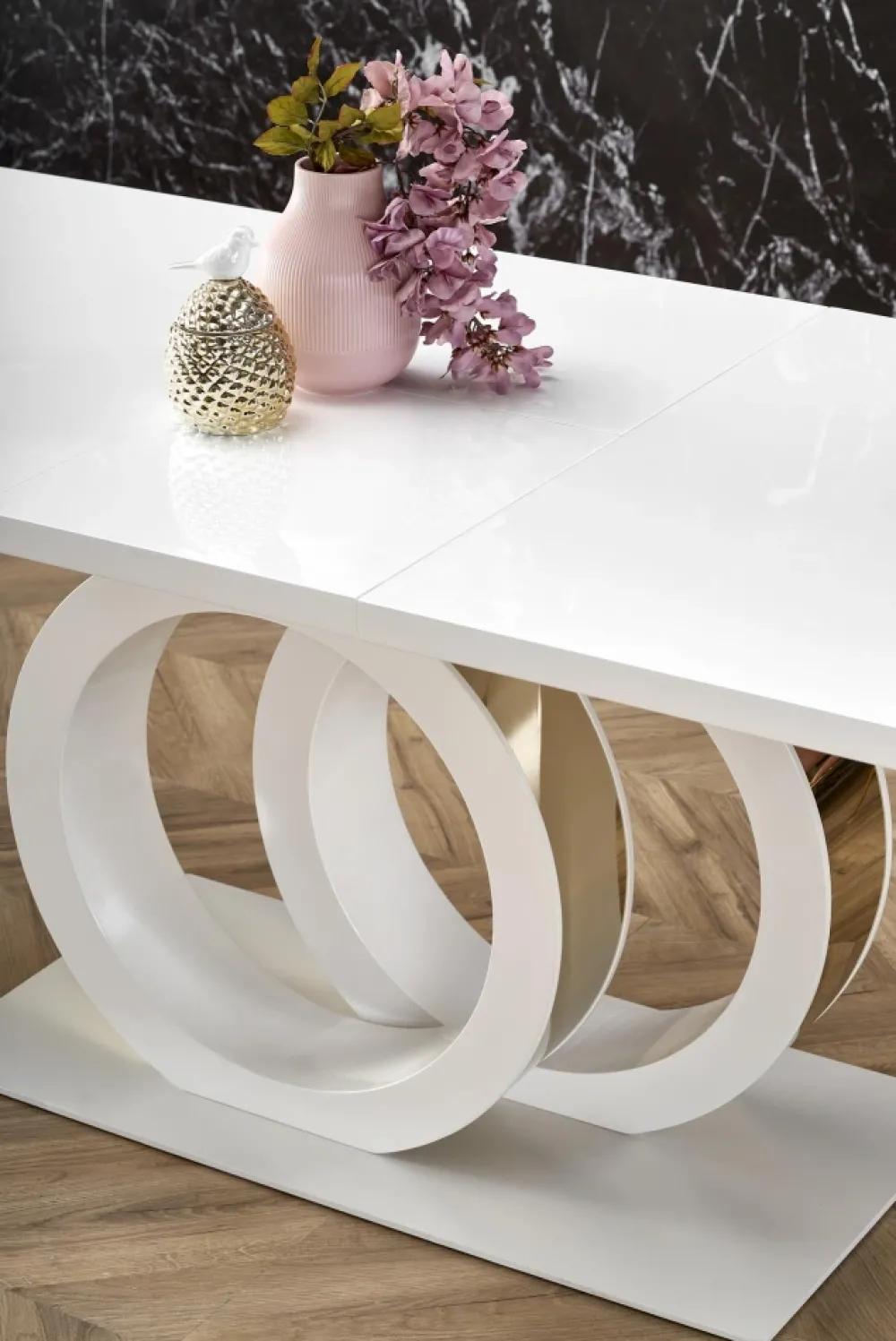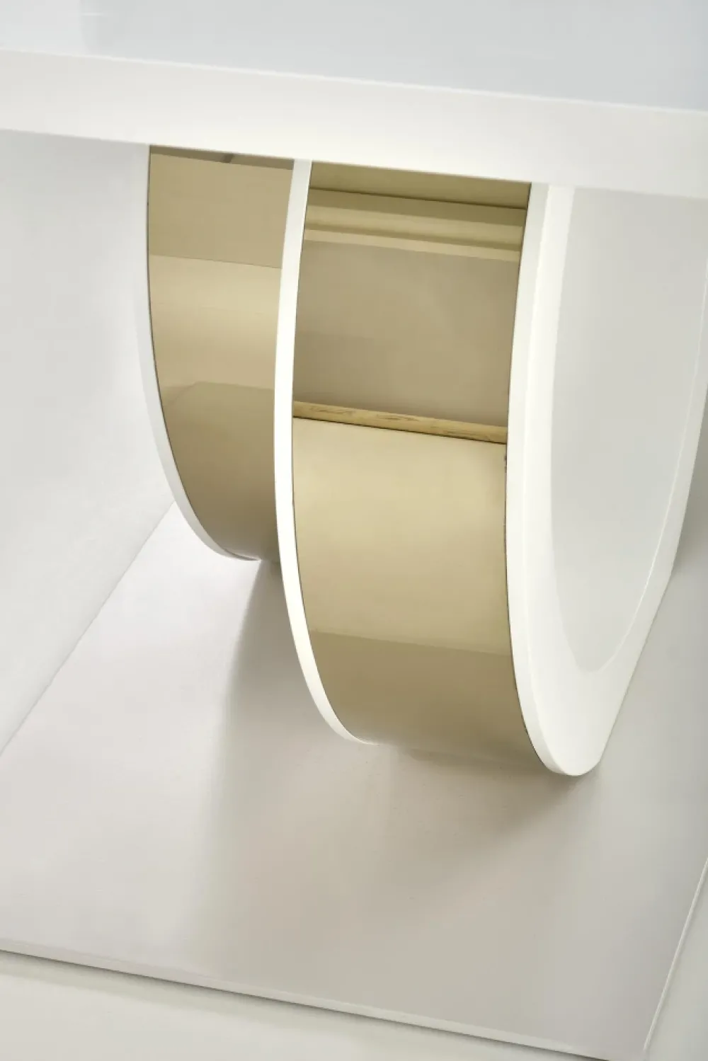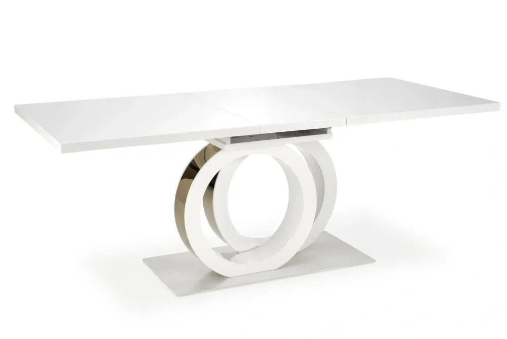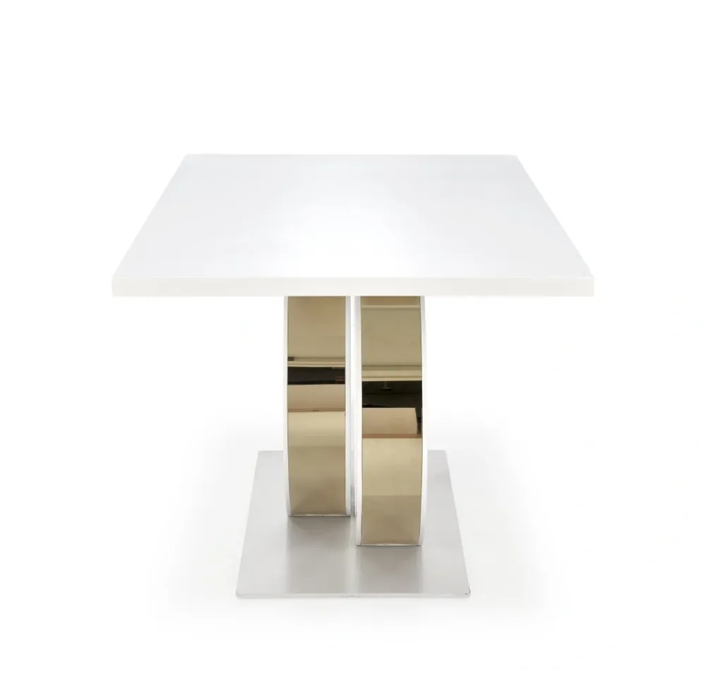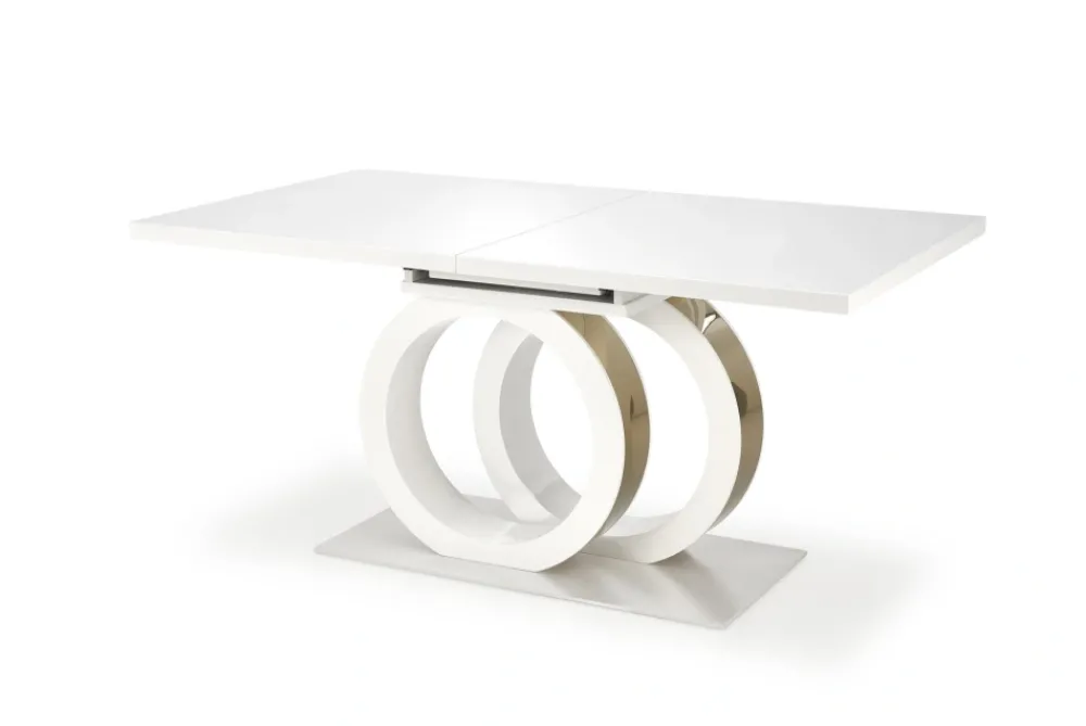 wymiary: 160-200/90/76 cm, stół rozkładany, materiał: MDF lakierowany / stal nierdzewna / stal malowana proszkowo, kolor: biały – złoty