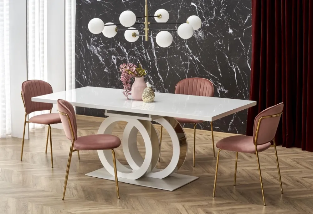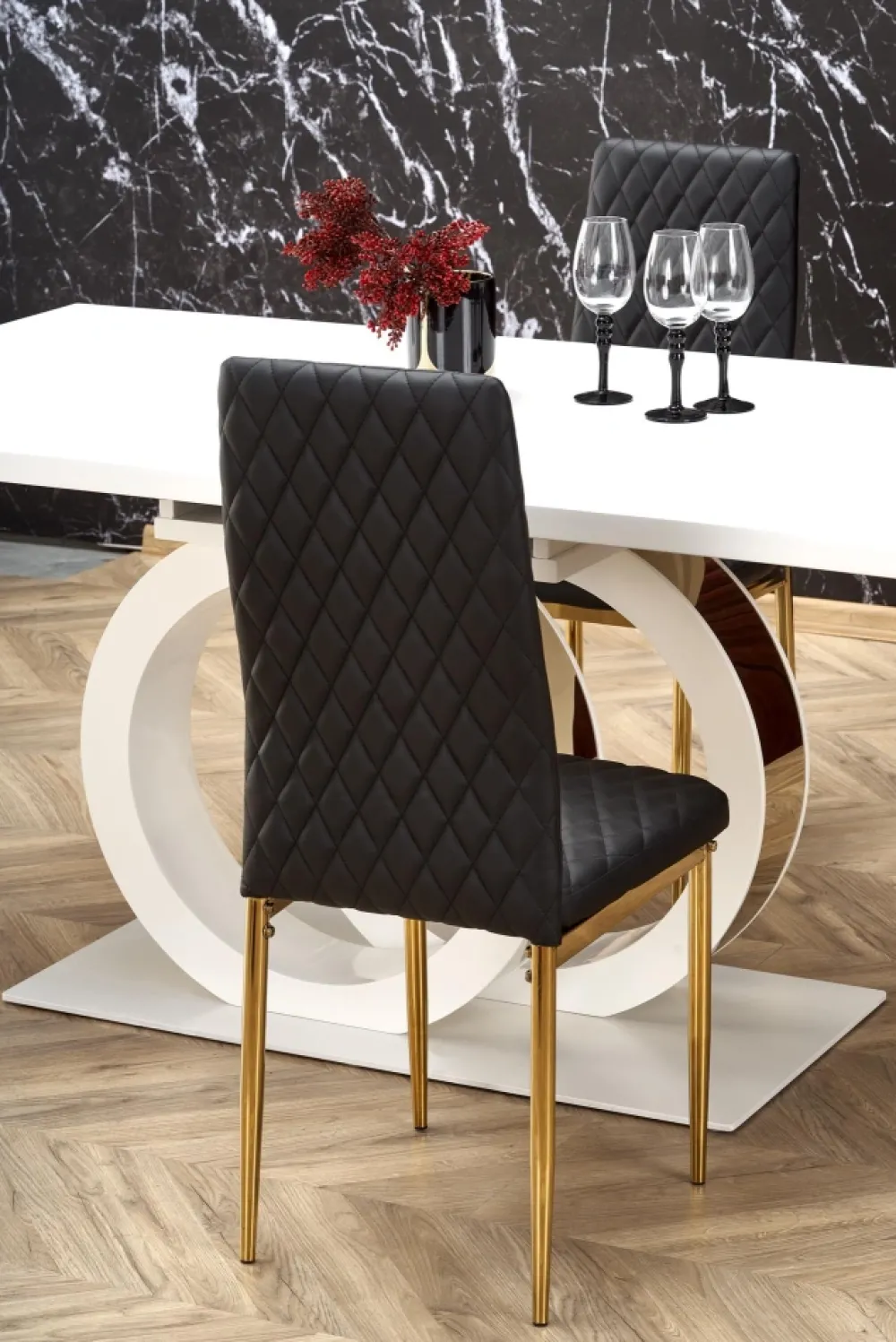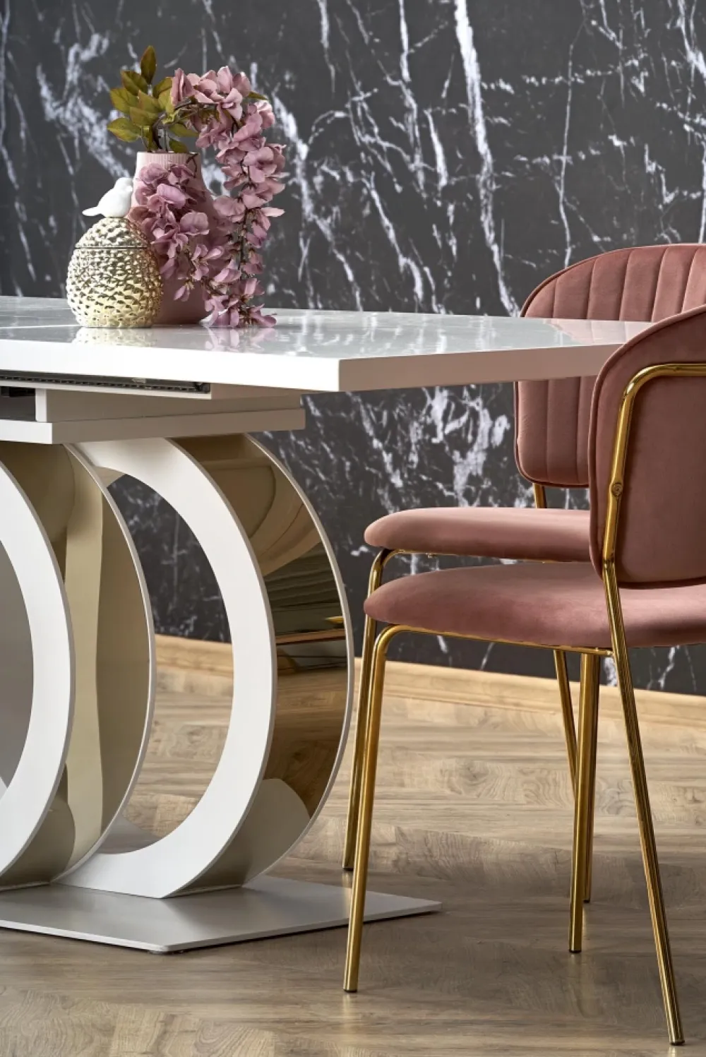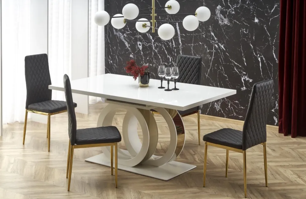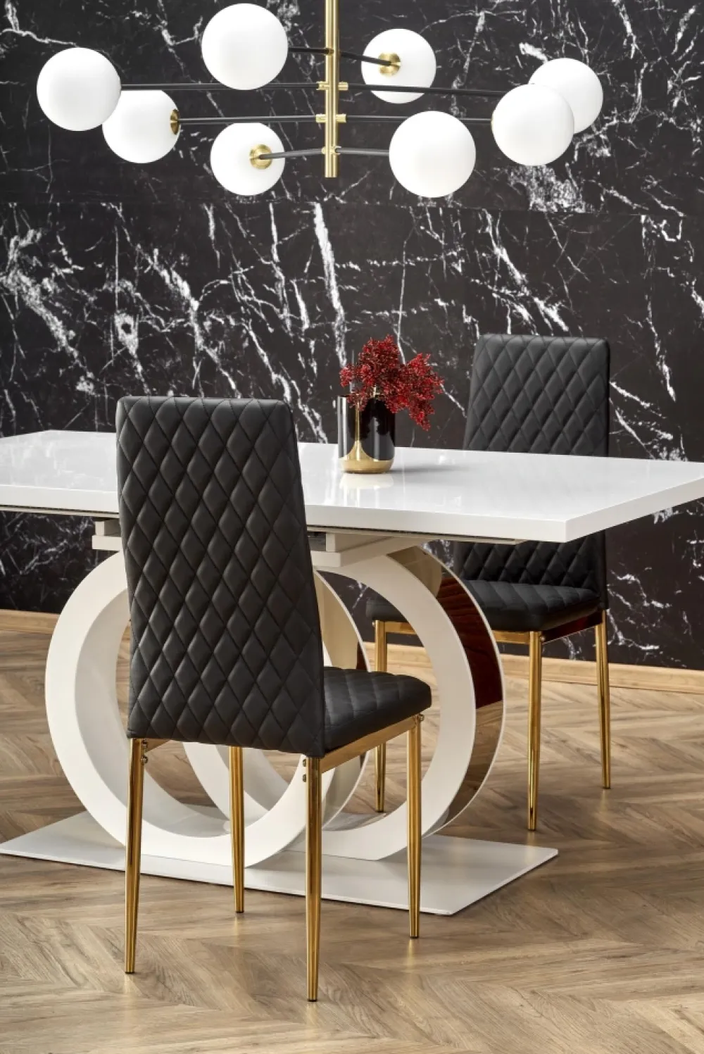 wymiary: 160-200/90/76 cm, stół rozkładany, materiał: MDF lakierowany / stal nierdzewna / stal malowana proszkowo, kolor: biały – złoty