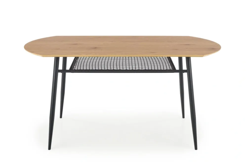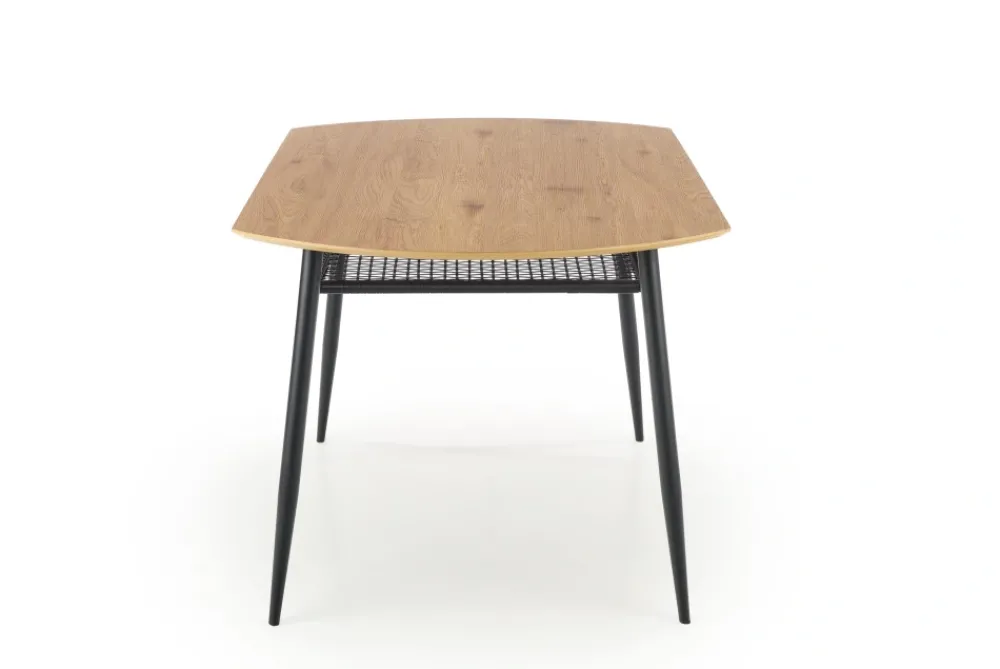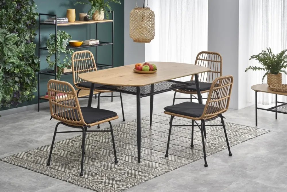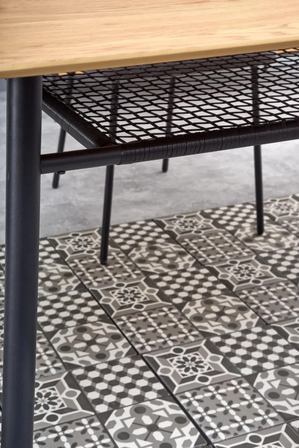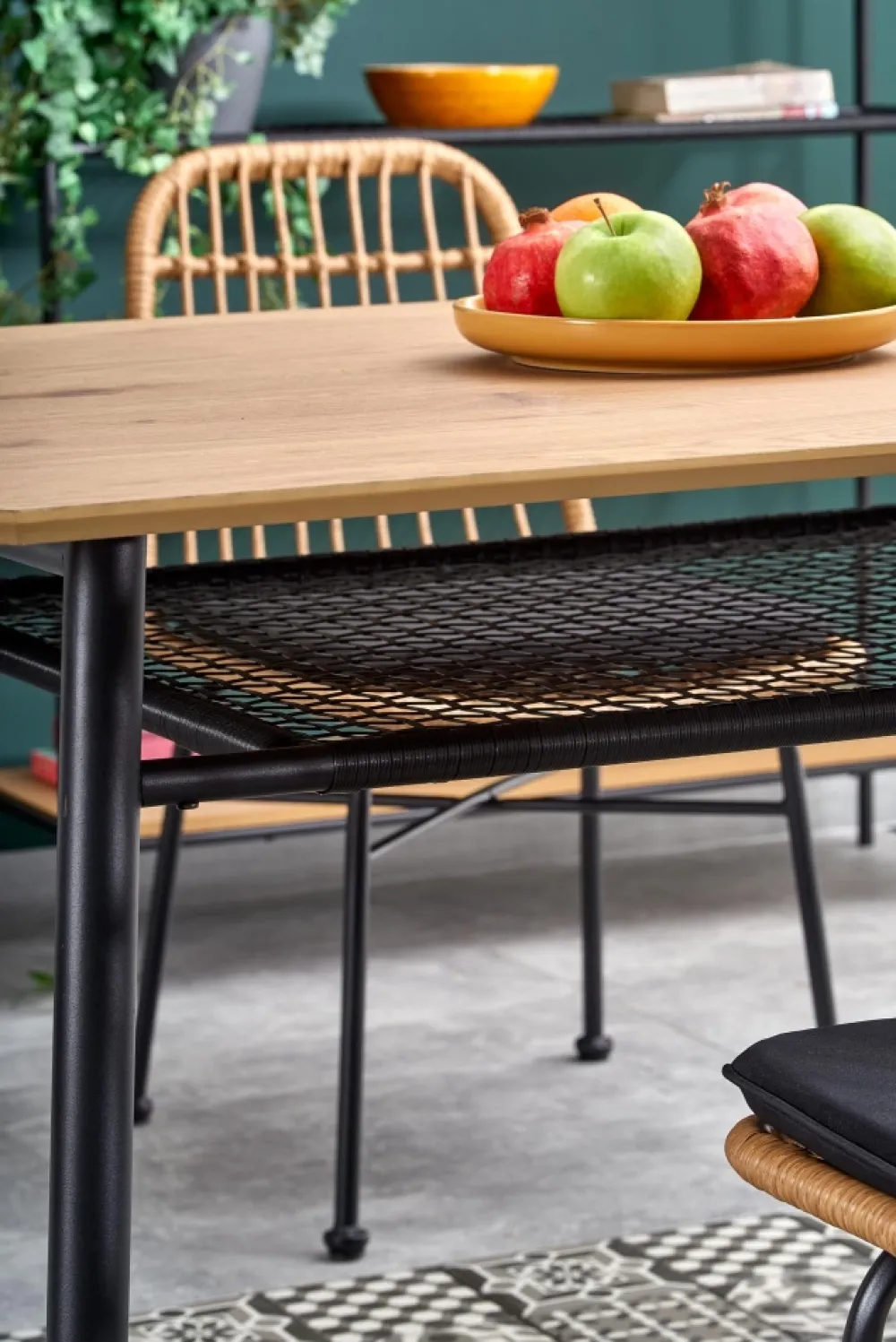 wymiary: 160/90/77 cm, materiał: MDF okleinowany / rattan syntetyczny / stal malowana proszkowo, kolor: blat – dąb złoty, nogi – czarny
