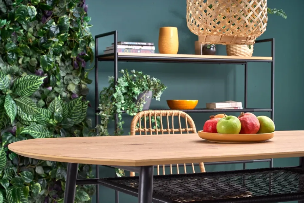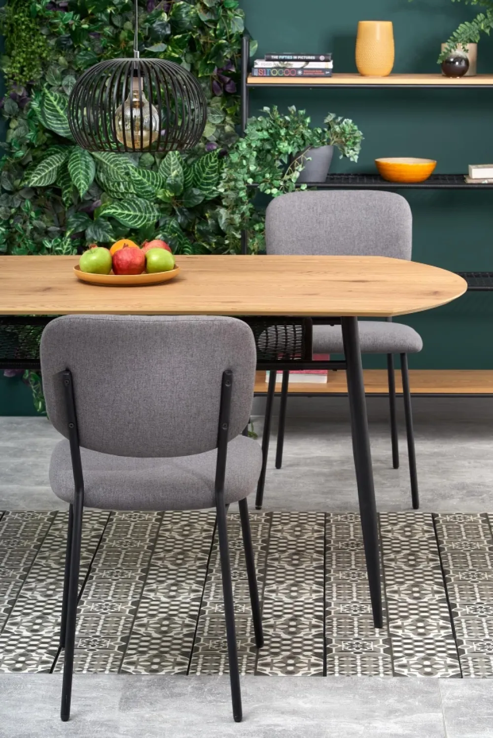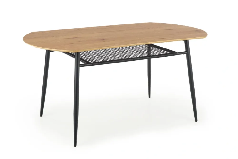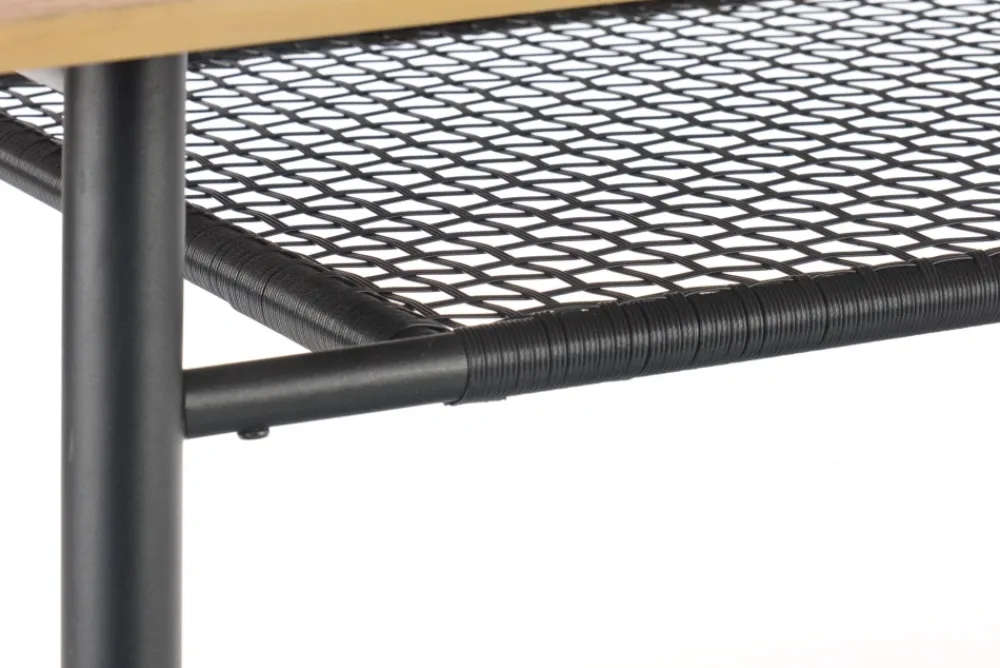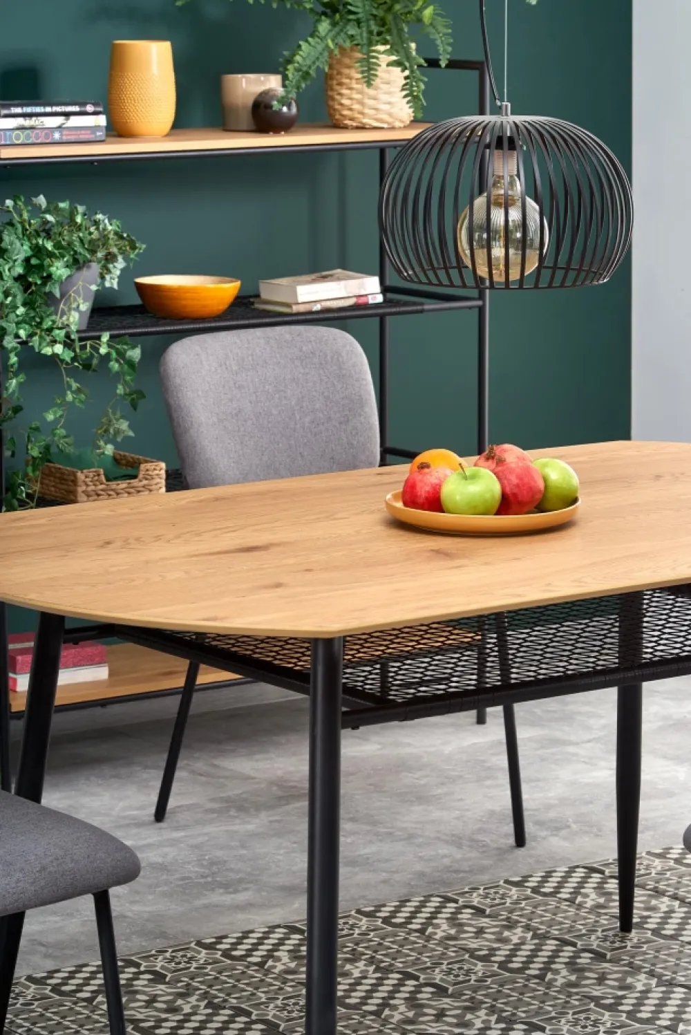 wymiary: 160/90/77 cm, materiał: MDF okleinowany / rattan syntetyczny / stal malowana proszkowo, kolor: blat – dąb złoty, nogi – czarny
