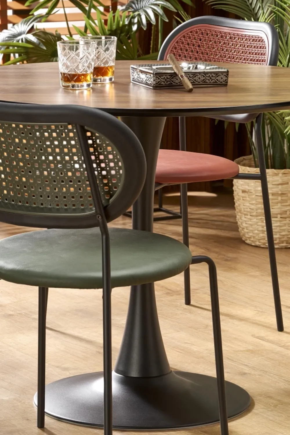 wymiary: fi 90/73 cm, materiał: MDF okleinowany / stal malowana proszkowo, kolor: blat – orzech, noga – czarny