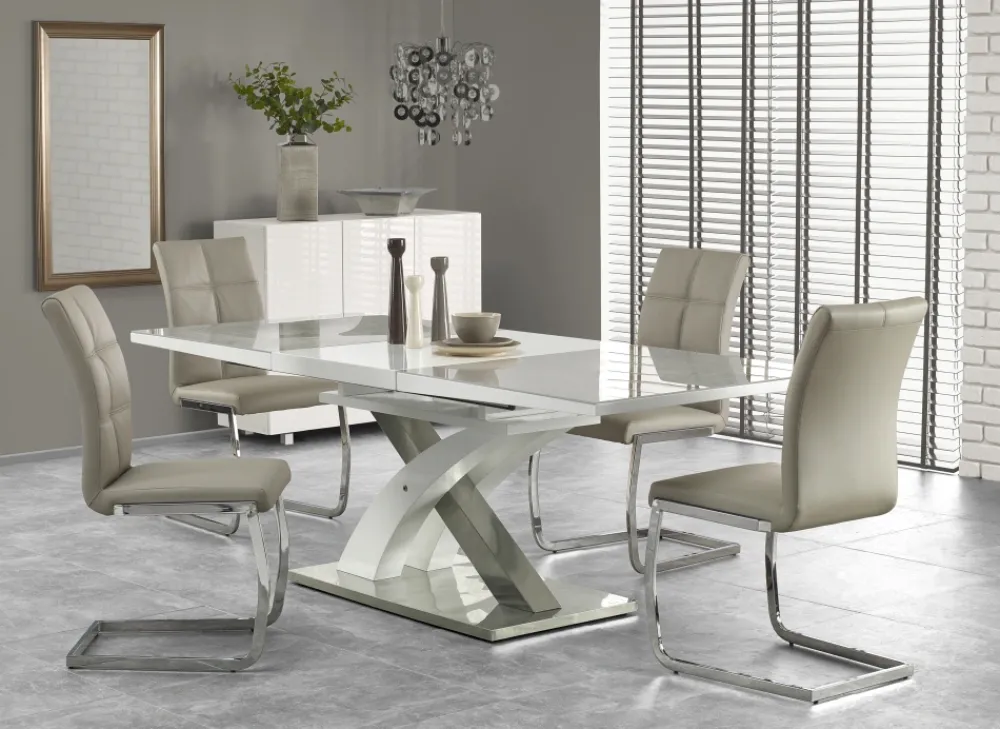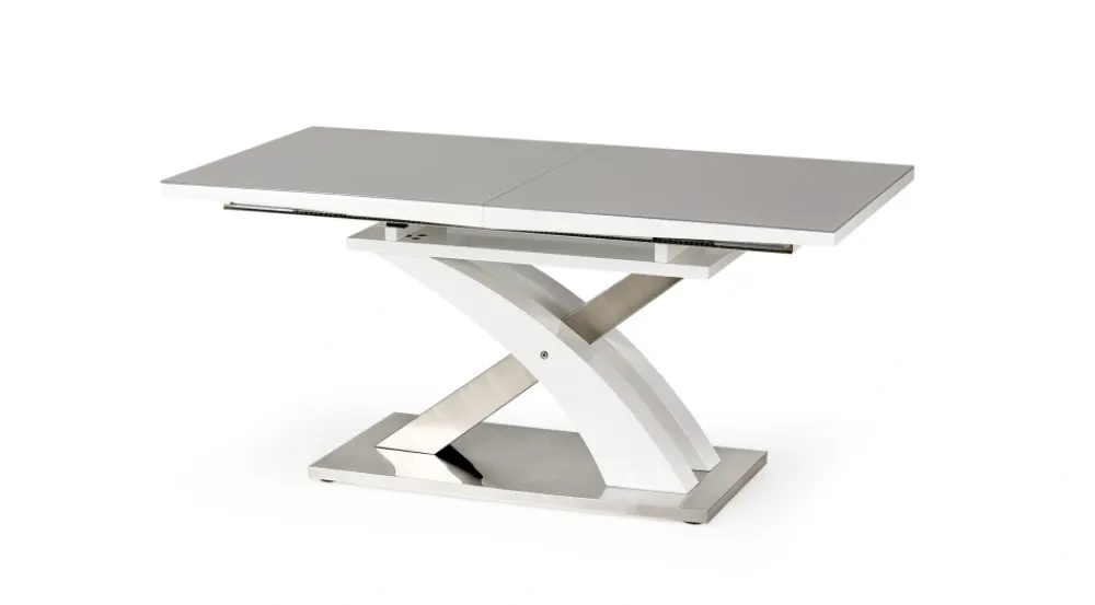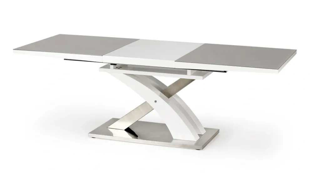 stół rozkładany, wymiary: 160÷220/90/78 cm, materiał: szkło / MDF lakierowany / stal nierdzewna, kolor: szkło – popiel, MDF – biały