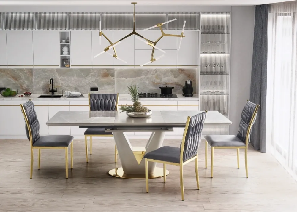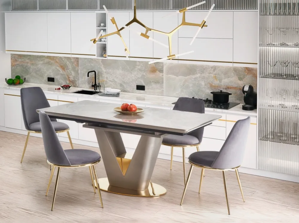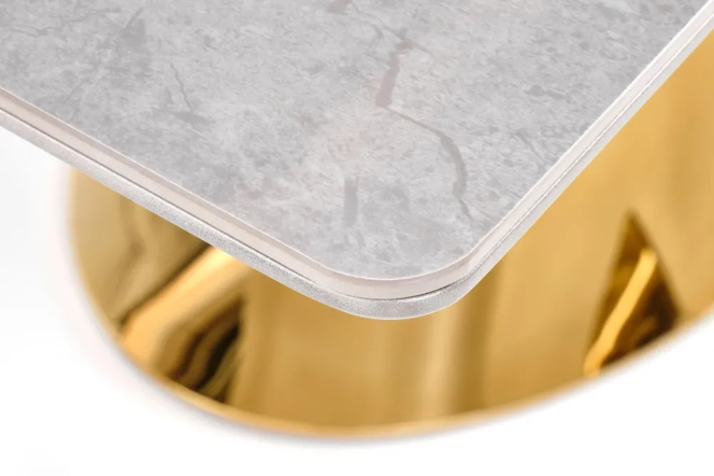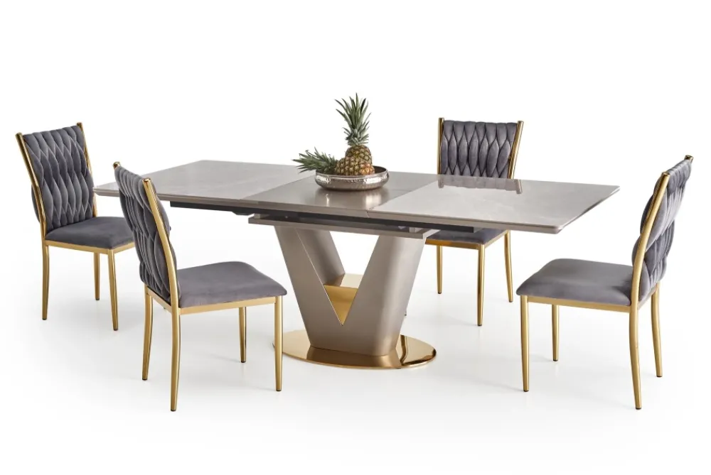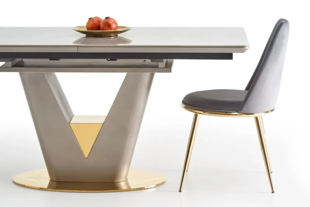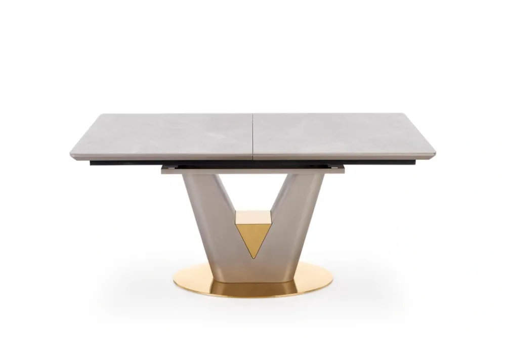 wymiary: 160-220/90/76 cm, stół rozkładany, materiał: ceramika / MDF lakierowany / stal chromowana, kolor: blat – popielaty marmur, noga – jasny popiel / złoty