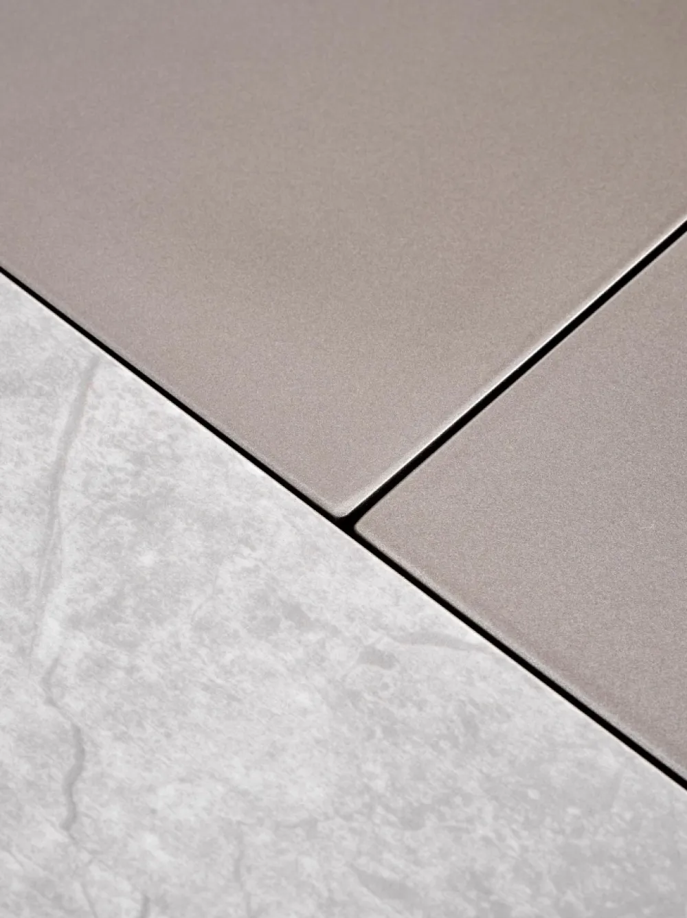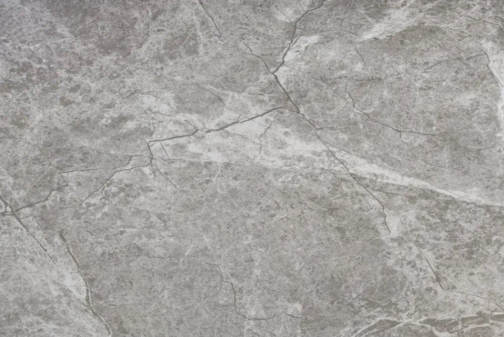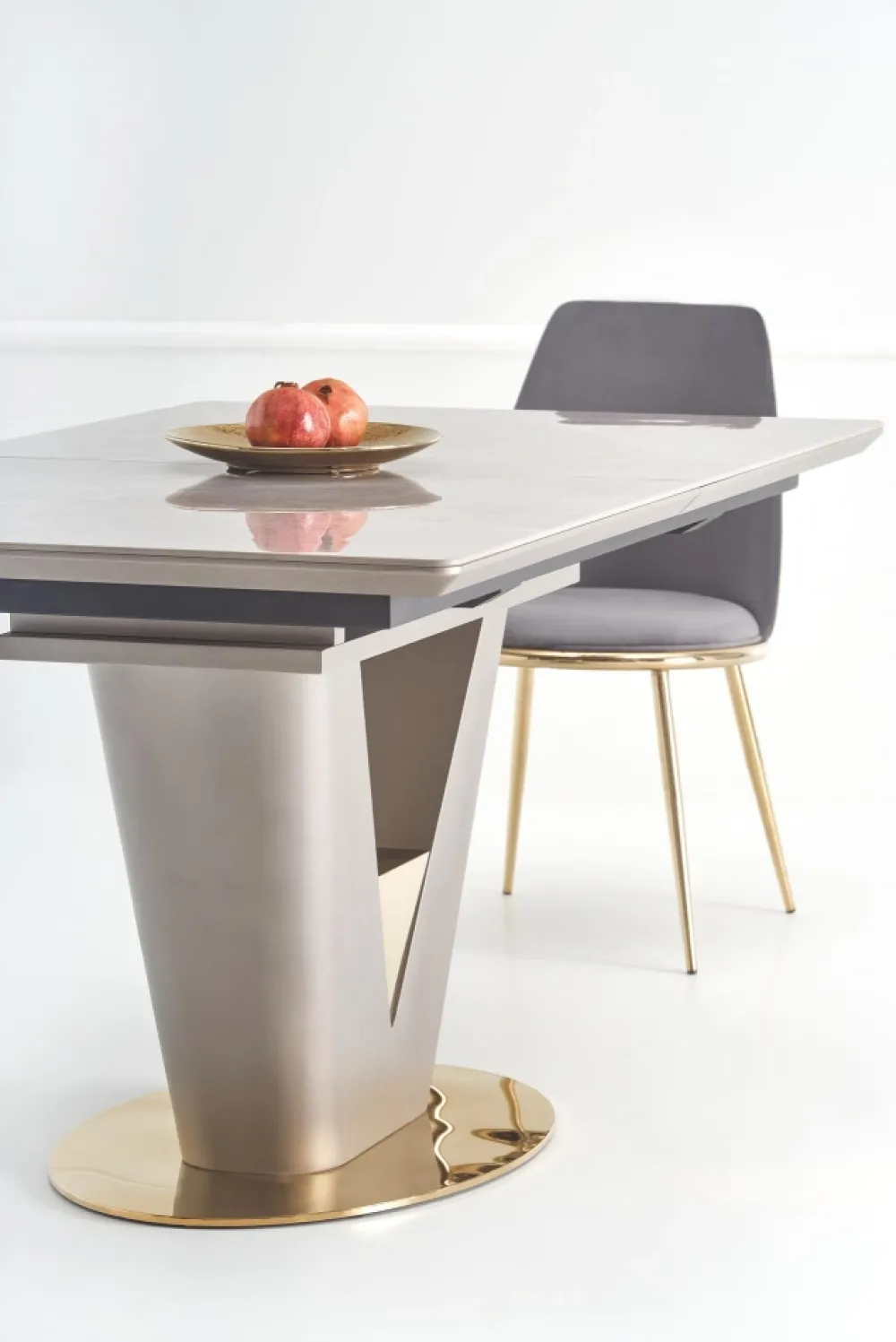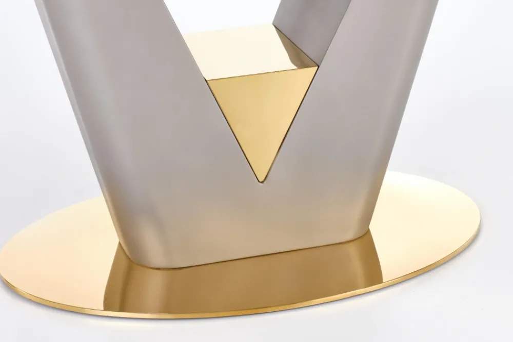 wymiary: 160-220/90/76 cm, stół rozkładany, materiał: ceramika / MDF lakierowany / stal chromowana, kolor: blat – popielaty marmur, noga – jasny popiel / złoty