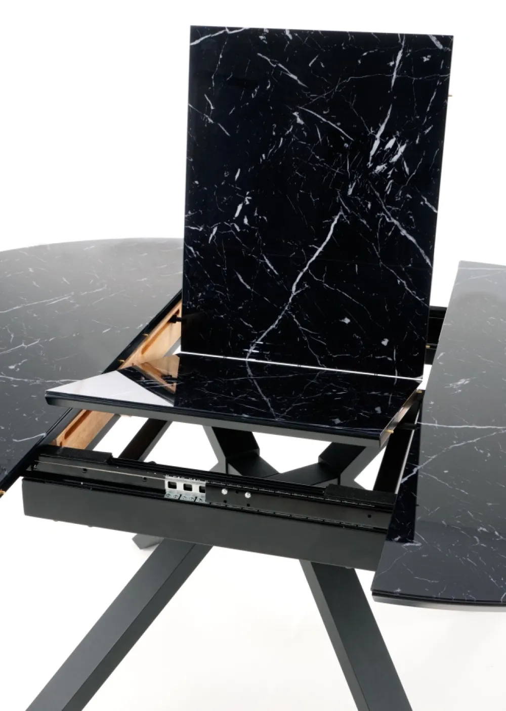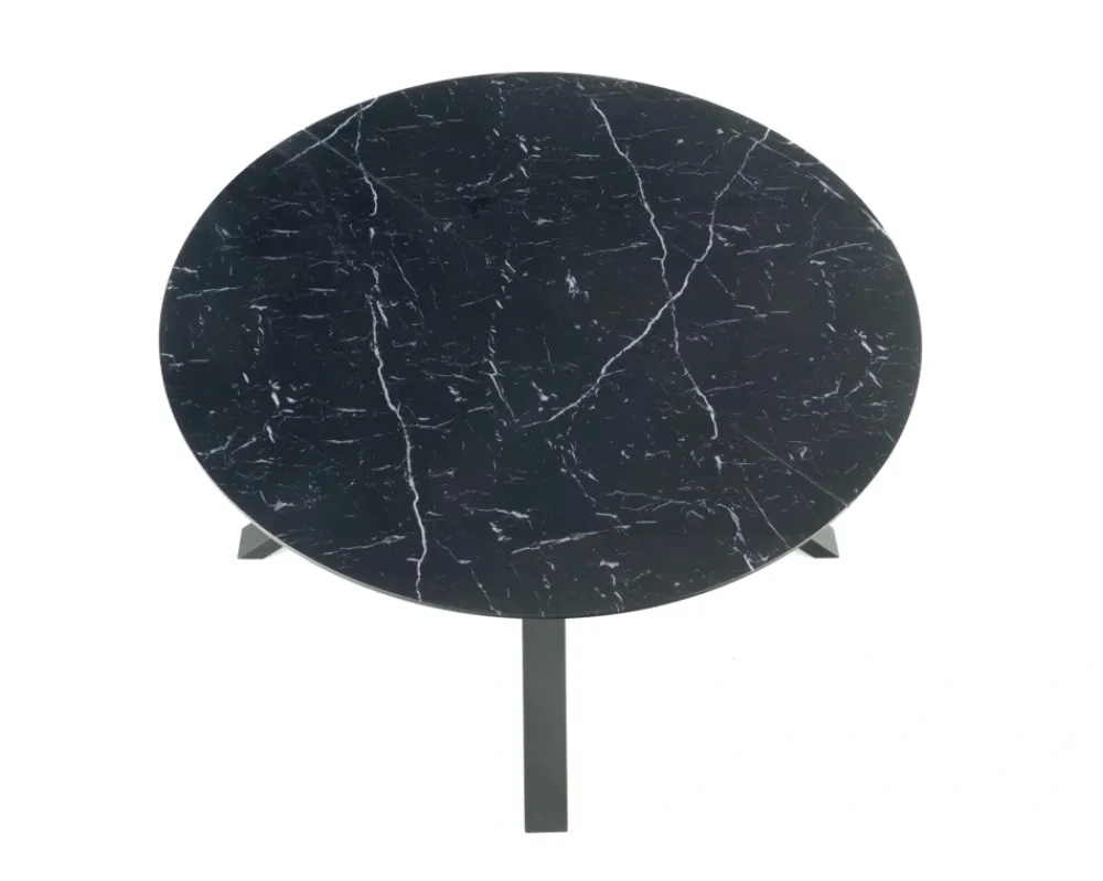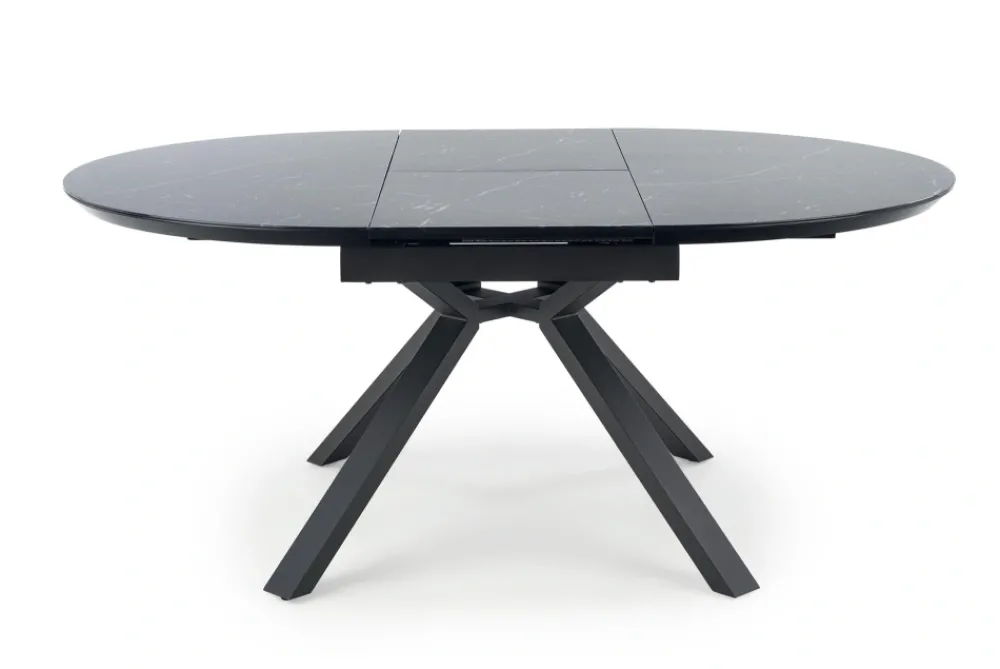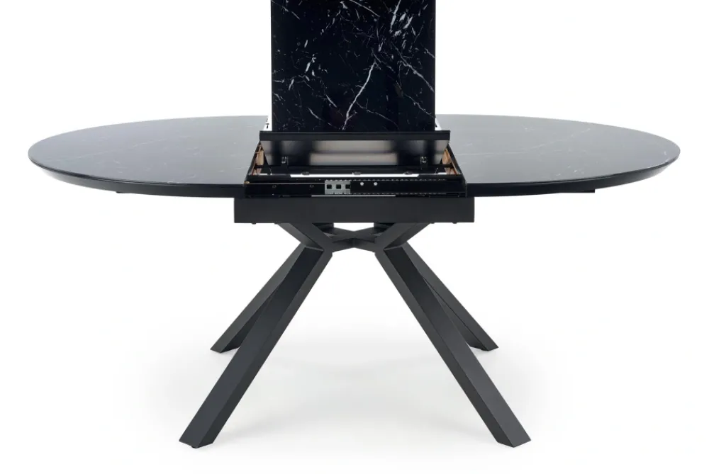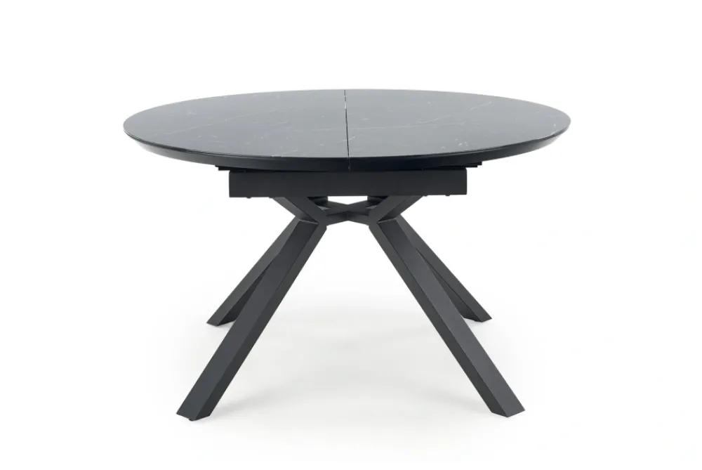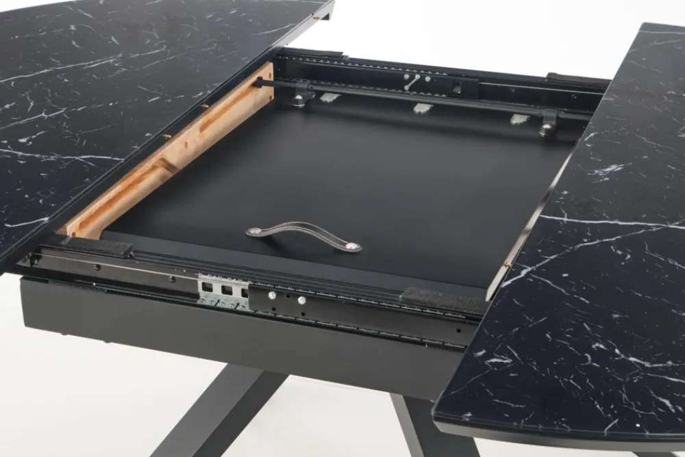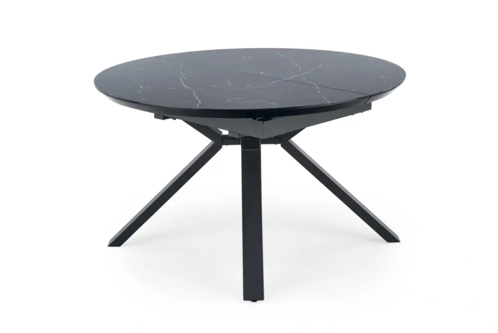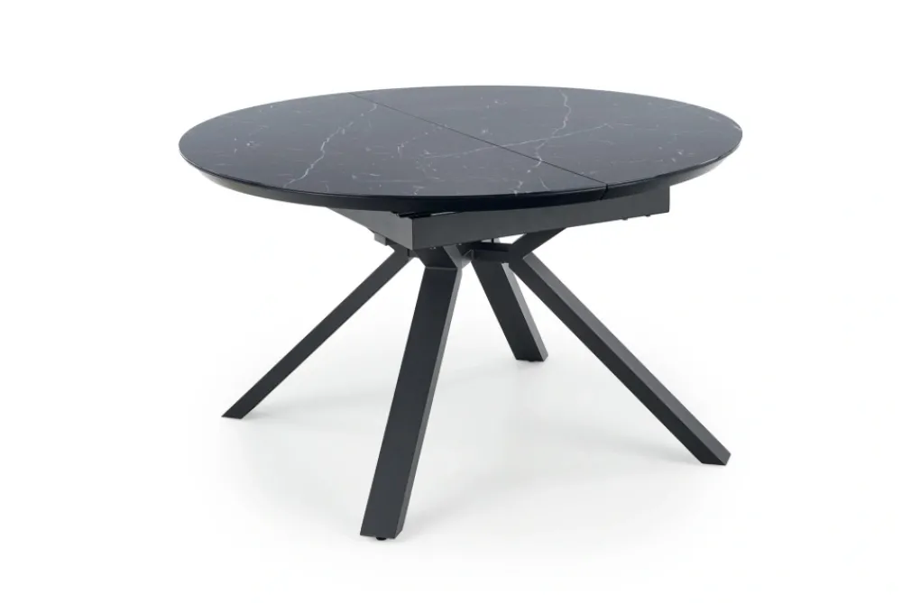 stół rozkładany, wymiary: 130-180/130/76 cm, materiał: szkło / MDF lakierowany / stal malowana proszkowo, kolor: blat – czarny marmur, nogi – czarny