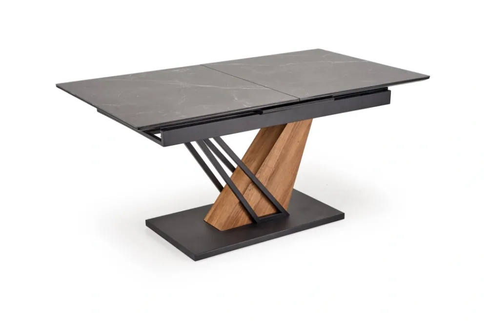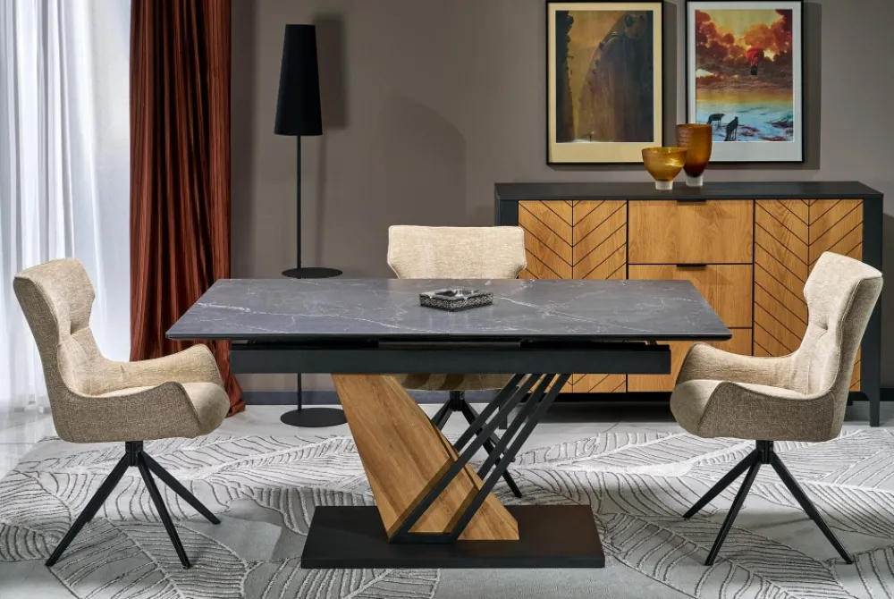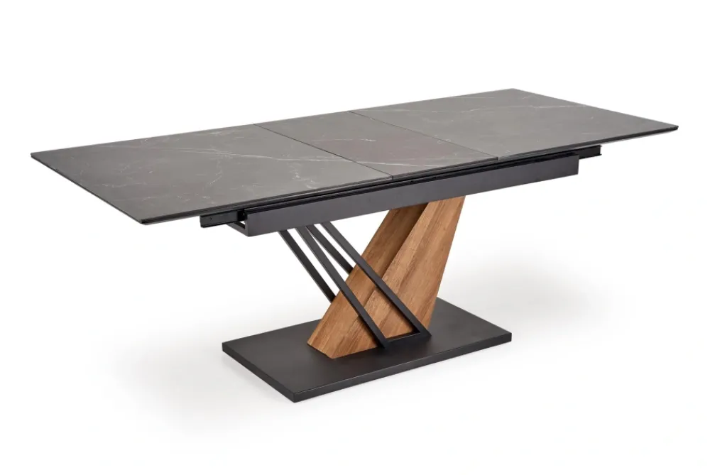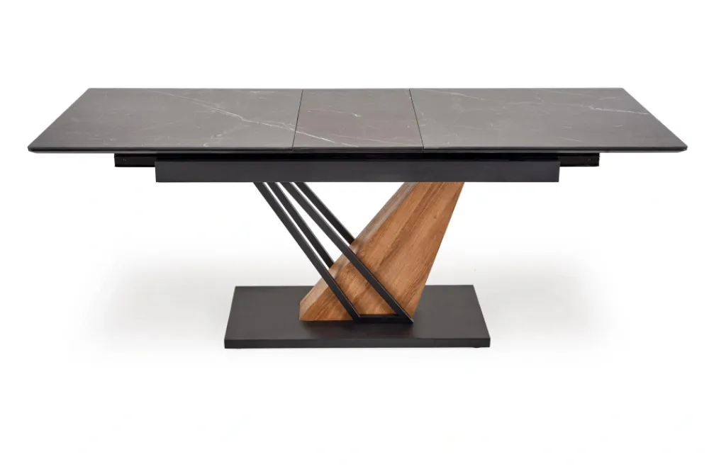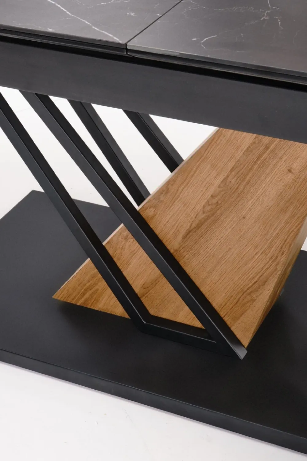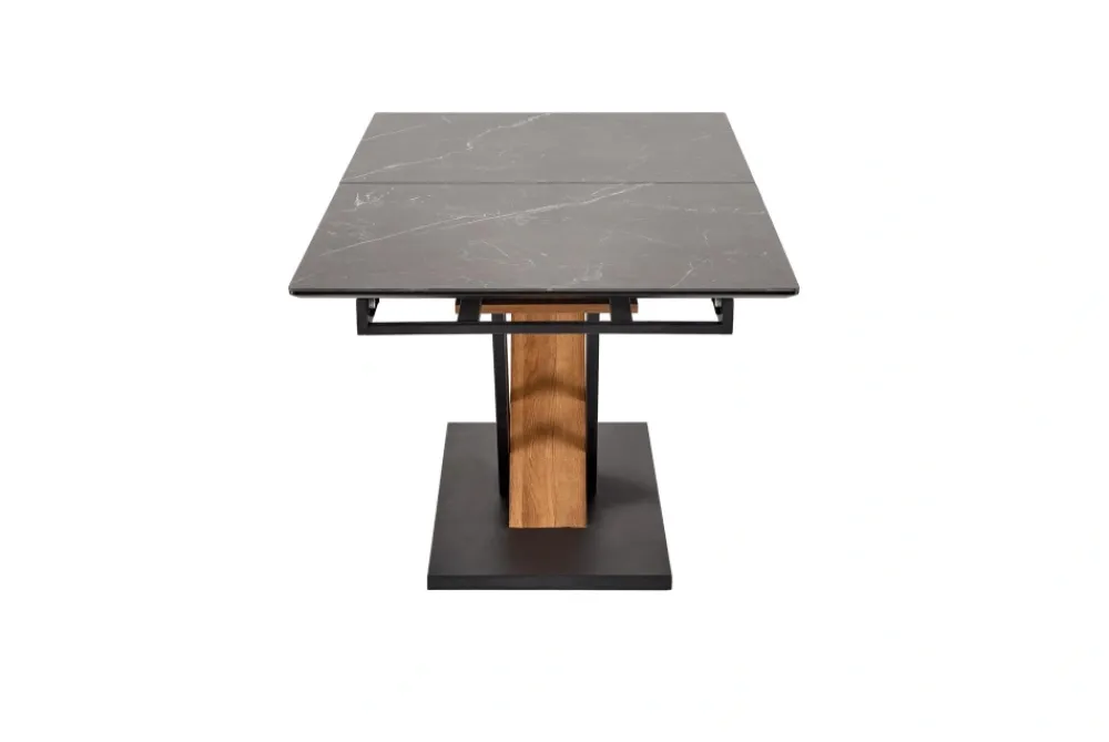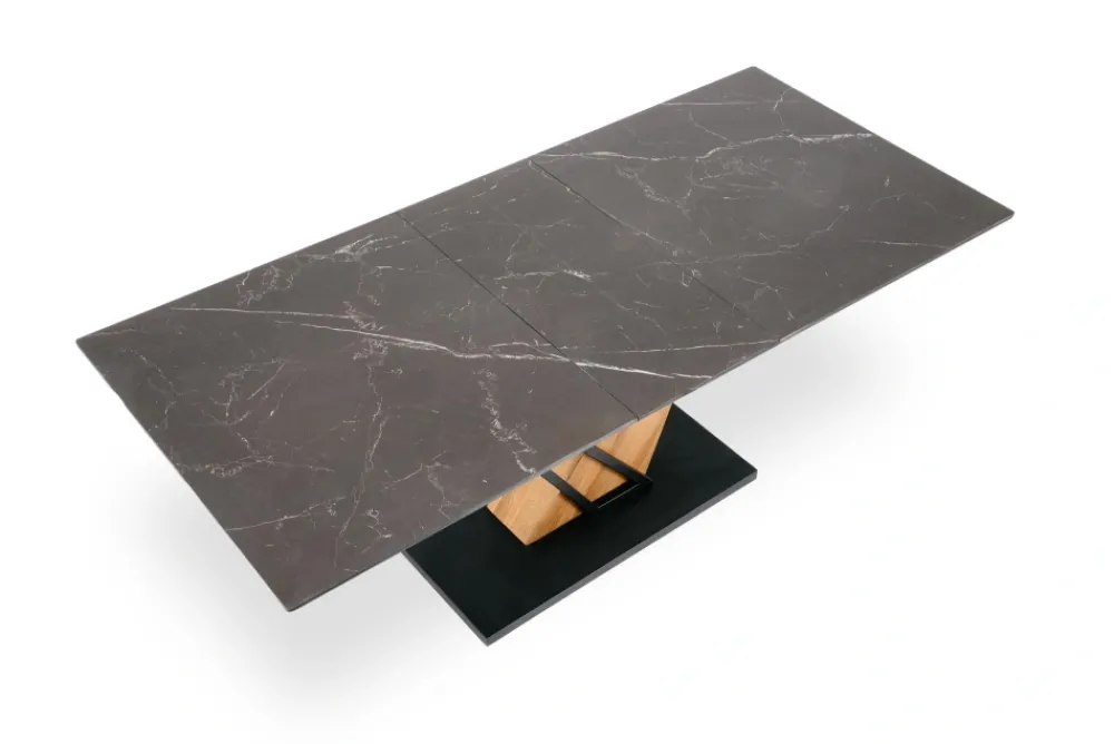 wymiary: 140-180/90/76 cm, stół rozkładany, materiał: spiek / MDF lakierowany / MDF okleinowany / stal malowana proszkowo, kolor: blat – czarny marmur, nogi – dąb złoty / czarny