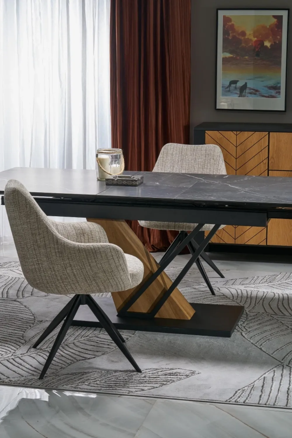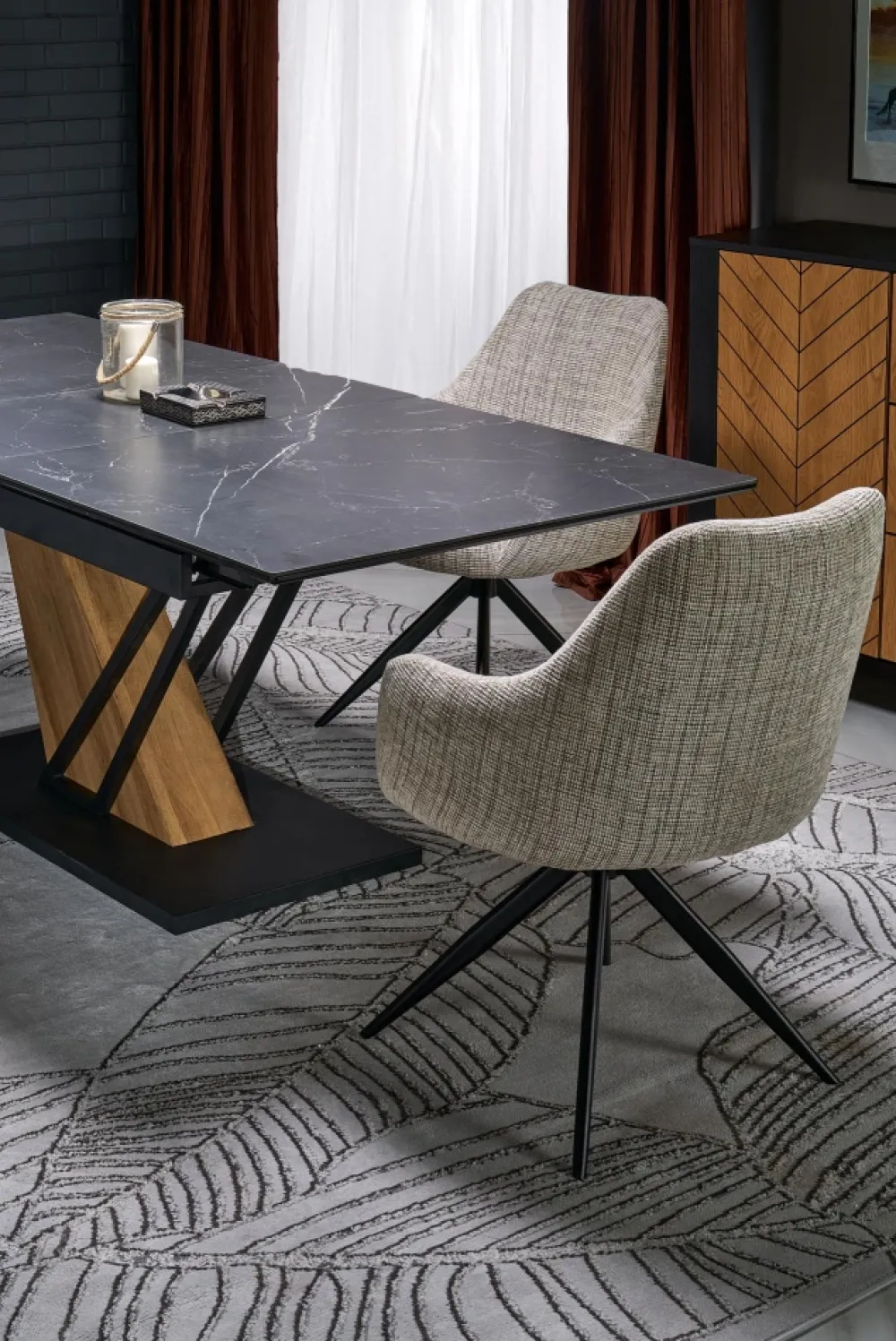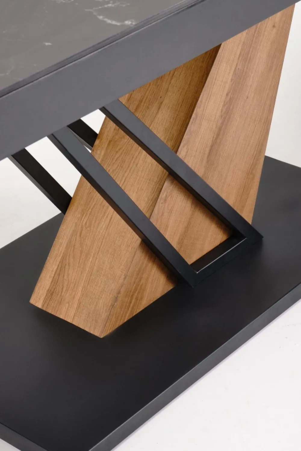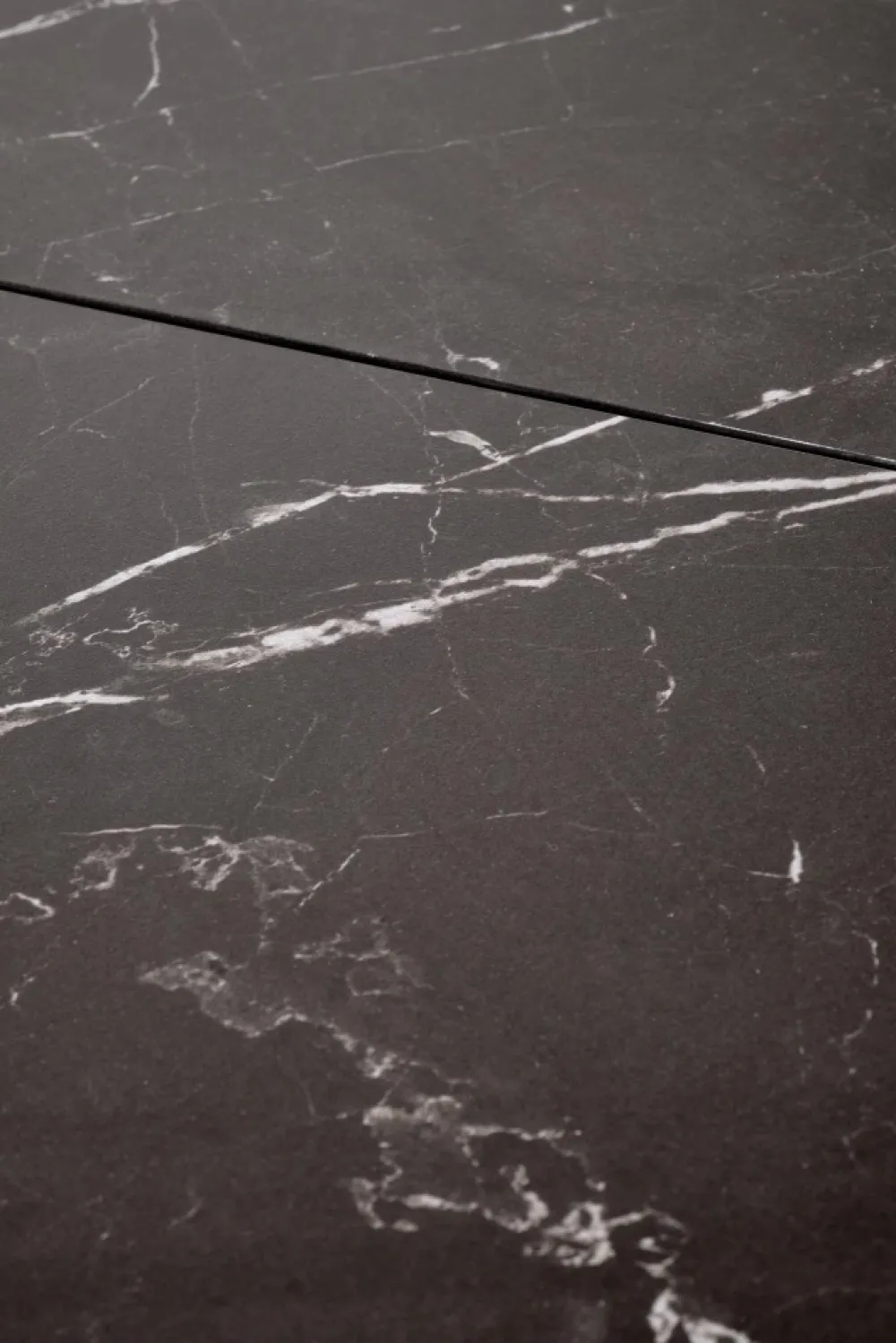 wymiary: 140-180/90/76 cm, stół rozkładany, materiał: spiek / MDF lakierowany / MDF okleinowany / stal malowana proszkowo, kolor: blat – czarny marmur, nogi – dąb złoty / czarny