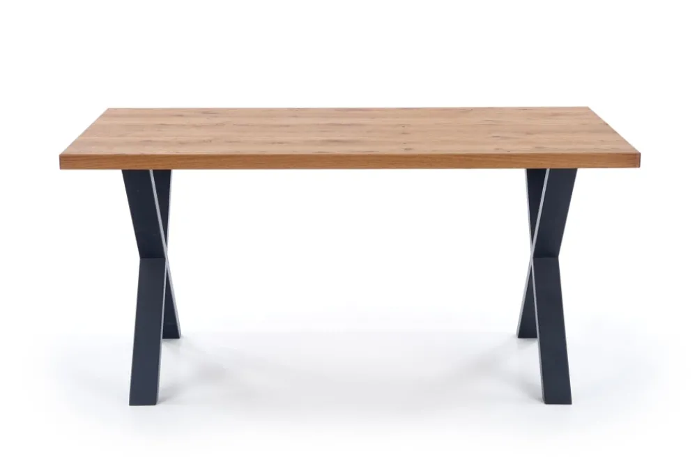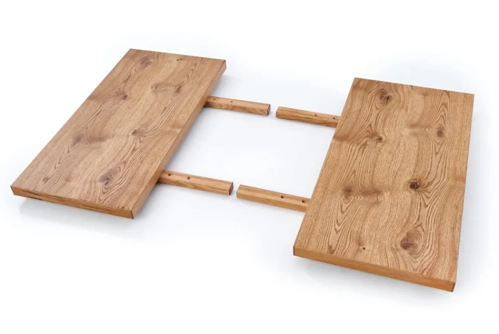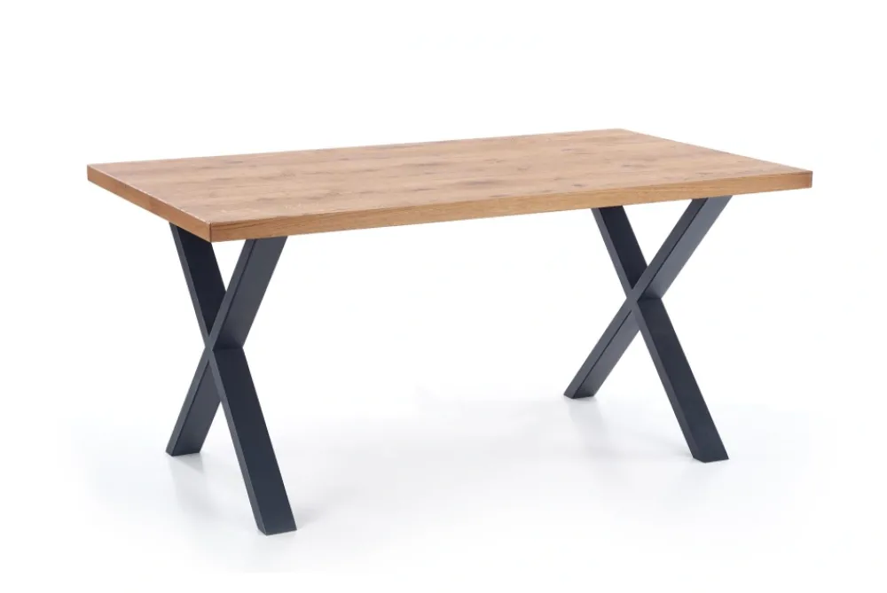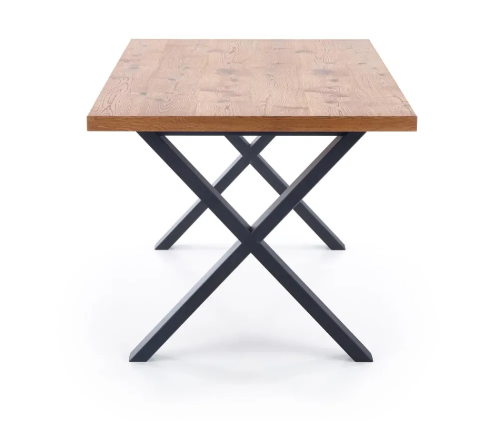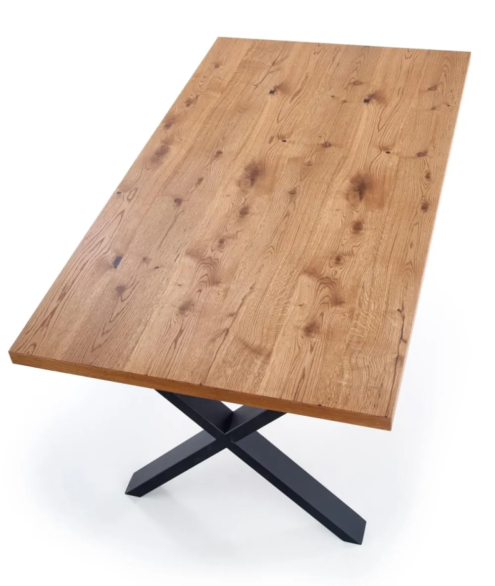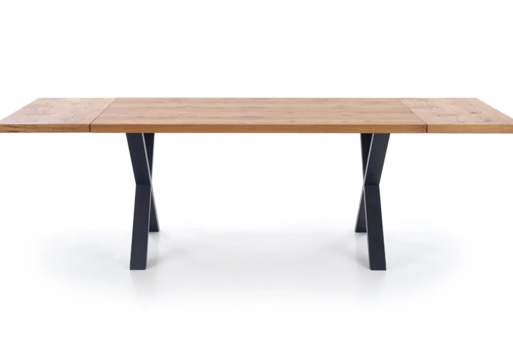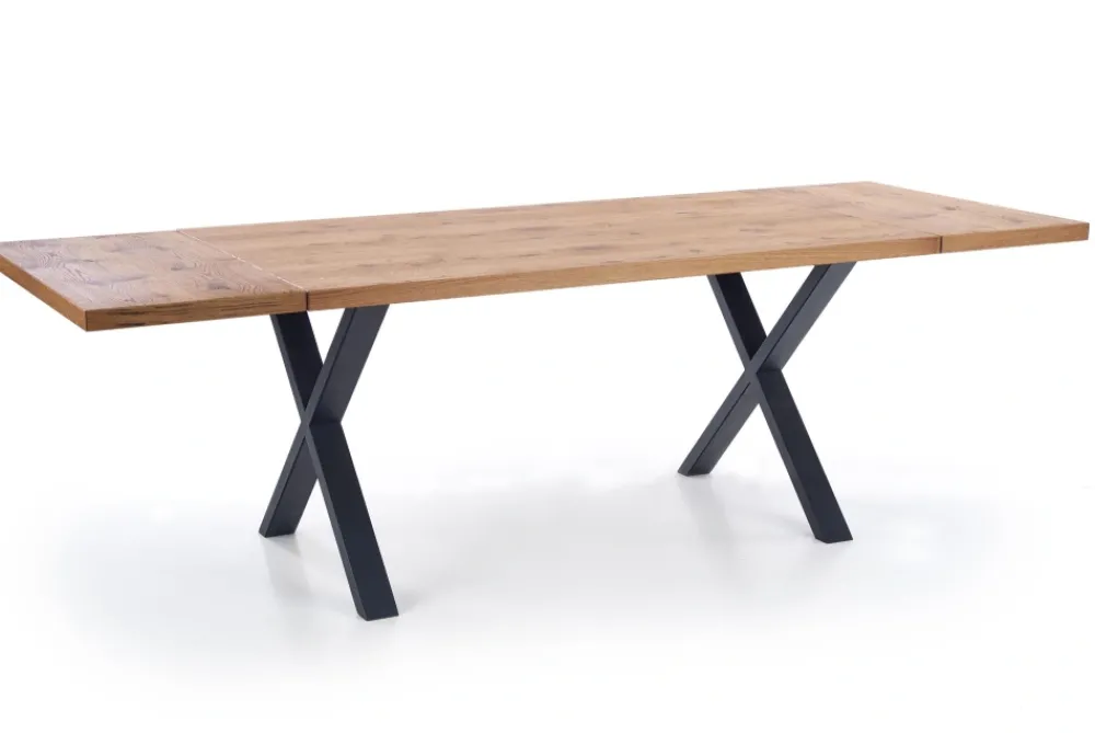 stół rozkładany, wymiary: 160÷250/90/76 cm, materiał: blat – płyta fornirowana, na obrzeżach drewno lite, nogi – stal malowana proszkowo, kolor: blat – jasny dąb, nogi – czarne Uwaga: blat olejowany, wymagający szczególnej konserwacji, szczegóły w instrukcji.Uwaga 2: blaty posiadają sęki, które są wypełnione czarną szpachlą, nie jest to wada produktu a naturalny i celowy wygląd blatu pokrytego fornirem, mający podkreślić rustykalny i wyjątkowy wygląd blatu.
