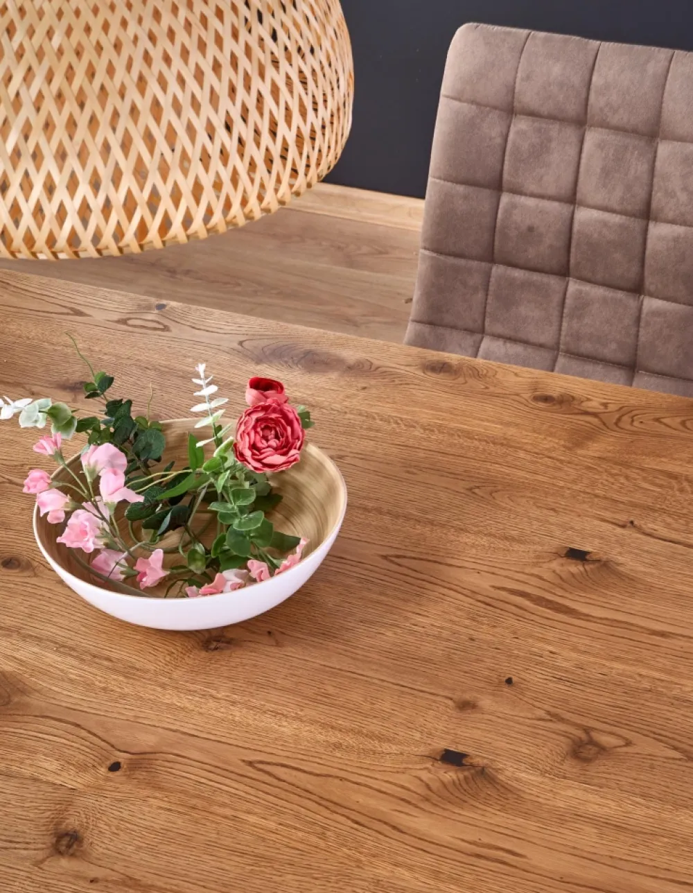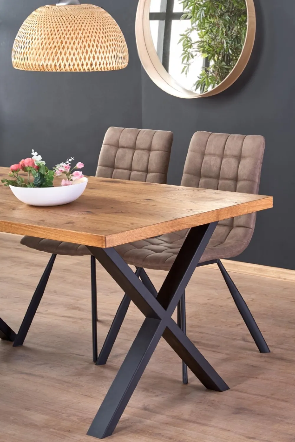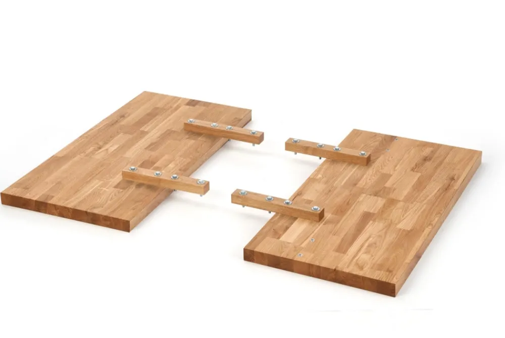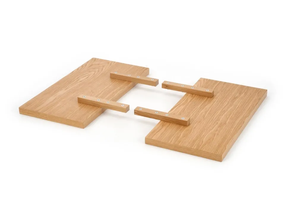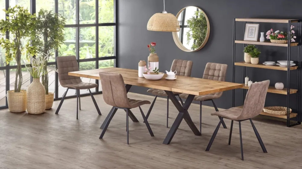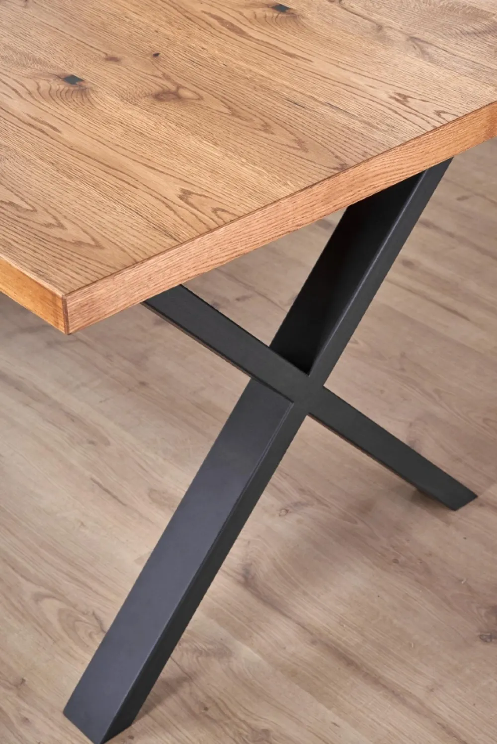 stół rozkładany, wymiary: 160÷250/90/76 cm, materiał: blat – płyta fornirowana, na obrzeżach drewno lite, nogi – stal malowana proszkowo, kolor: blat – jasny dąb, nogi – czarne Uwaga: blat olejowany, wymagający szczególnej konserwacji, szczegóły w instrukcji.Uwaga 2: blaty posiadają sęki, które są wypełnione czarną szpachlą, nie jest to wada produktu a naturalny i celowy wygląd blatu pokrytego fornirem, mający podkreślić rustykalny i wyjątkowy wygląd blatu.