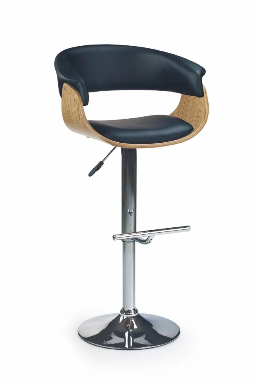 wymiary: 59/46/90÷112 cm, materiał: stal chromowana / sklejka gięta / eco skóra, kolor: drewno – jasny dąb, eco skóra – czarny