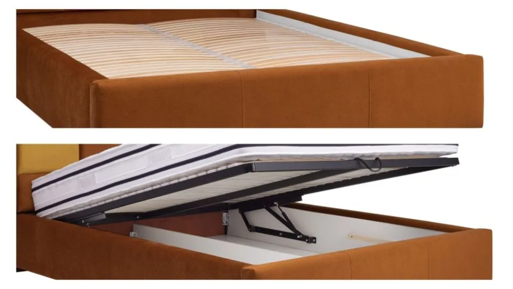 Prezentowany wariant posiada pojemnik na pościel. W cenę wliczony jest stelaż unoszony za pomocą siłowników gazowych. Rama stelaża jest metalowa i połączona i drewnianymi listwami amortyzującymi. Pojemnik na pościel wyśmienicie wykorzystuje wolną przestrzeń pod stelażem i przez swoją wielkość wpływa pozytywnie na funkcjonalność produktu. Całość pojemnika wykończona jest estetyczną i łatwą w utrzymaniu czystości białą płytą laminowaną. Cena nie obejmuje materaca.