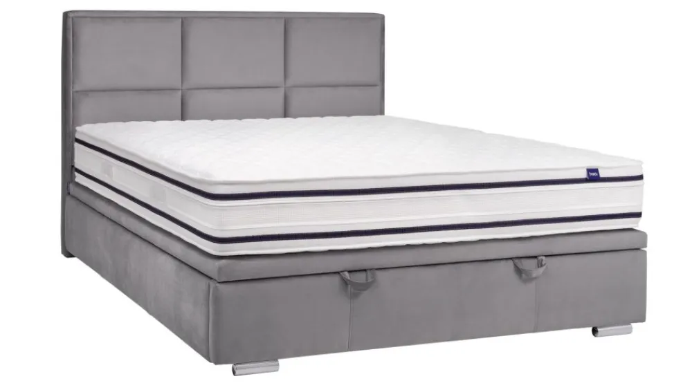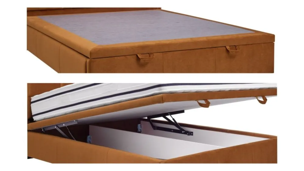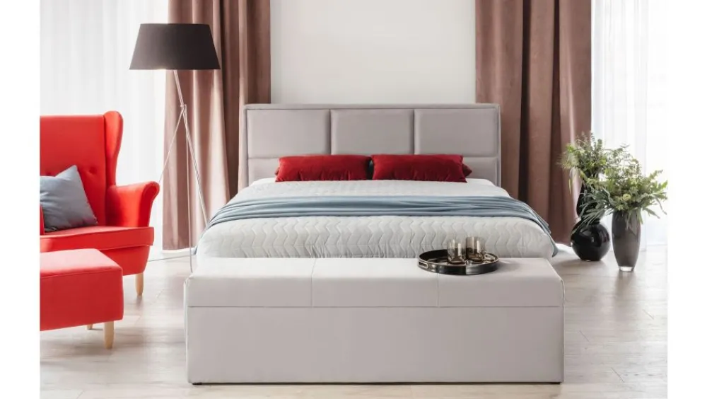 Model w wersji Slim – dedykowany mniejszym pomieszczeniom. Konstrukcja pod materac jest jedynie kilka centymetrów szersza od materaca, dzięki czemu oszczędzamy na prawdę sporo miejsca. Podobnie sytuacja ma się z wezgłowiem, które nie wystaje poza obręb bocznych krawędzi. Stelaż zintegrowany z całym łóżkiem (część zestawu) – konstrukcja drewniana, klejona + dodatkowo wzmocniona wkrętami. Całość stelaża została otapicerowana, dzięki czemu tworzy z łóżkiem spójną całość. Za unoszenie konstrukcji odpowiadają siłowniki gazowe, które umożliwiają proste otwieranie i zamykanie. Duży pojemnik na pościel wykończony estetyczną płytą laminowaną w kolorze białym. Dwie wygodne rączki do unoszenia stelażu poprawiają funkcjonalność. Cena nie obejmuje materaca.