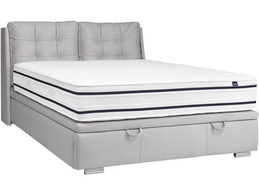 Model w wersji Slim – dedykowany mniejszym pomieszczeniom. Konstrukcja pod materac jest jedynie kilka centymetrów szersza od materaca, dzięki czemu oszczędzamy naprawdę sporo miejsca. W przypadku modelu Novio szerokość łóżka jest jedynie szersza w okolicach wezgłowia. Dzieje się tak za sprawą samej konstrukcji, boczne wstawki są elementami konstrukcyjnymi, które tworzą podstawę do zamocowania dwóch, dużych poduszek. Stelaż zintegrowany z całym łóżkiem (część zestawu) – konstrukcja drewniana, tapicerowana z siłownikami gazowymi umożliwiającymi proste otwieranie i zamykanie. Krawędzie stelaża są otapicerowane tą samą tkaniną, dzięki stelaż delikatnie wkomponowuje się do reszty i tworzy spójną, estetyczną całość. Duży pojemnik na pościel wykończony estetyczną płytą laminowaną w kolorze białym. Cena nie obejmuje materaca.