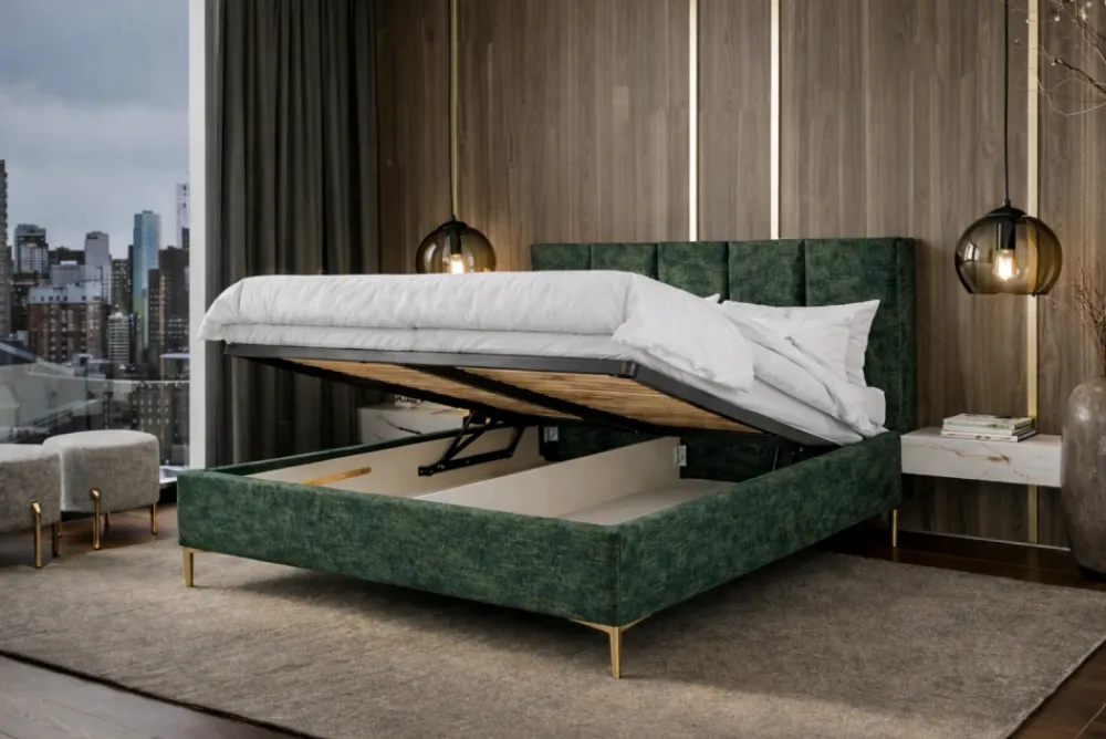 Praktyczność jest równie ważna jak wygląd. Łóżko GAJA z pojemnikiem na pościel oferuje przestronną skrzynię, w której wygodnie przechowasz pościel, koce czy sezonowe tekstylia. Solidny mechanizm podnoszenia stelaża działa płynnie i lekko, dzięki czemu codzienne korzystanie z pojemnika jest szybkie i bezproblemowe – nawet jedną ręką.